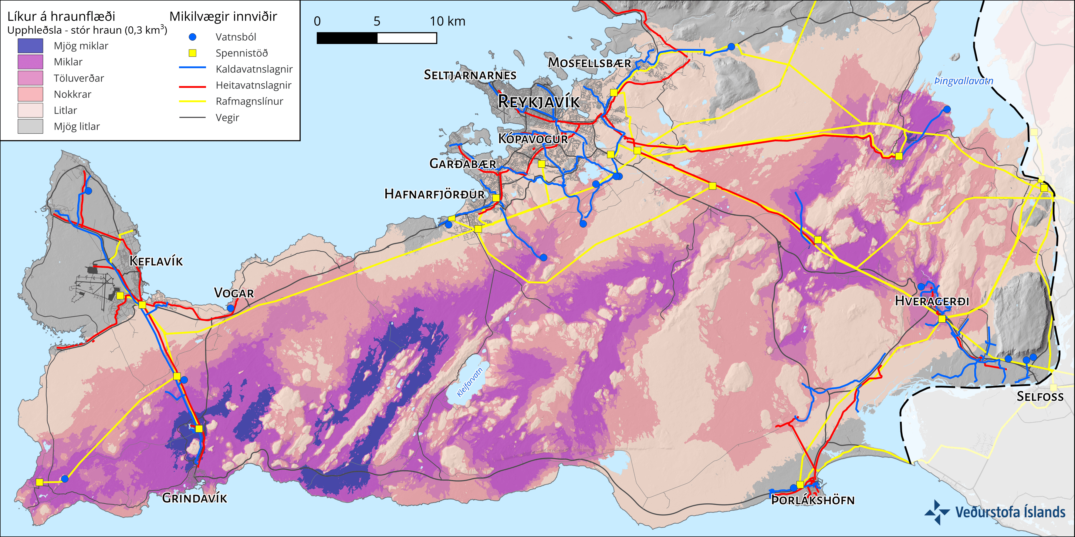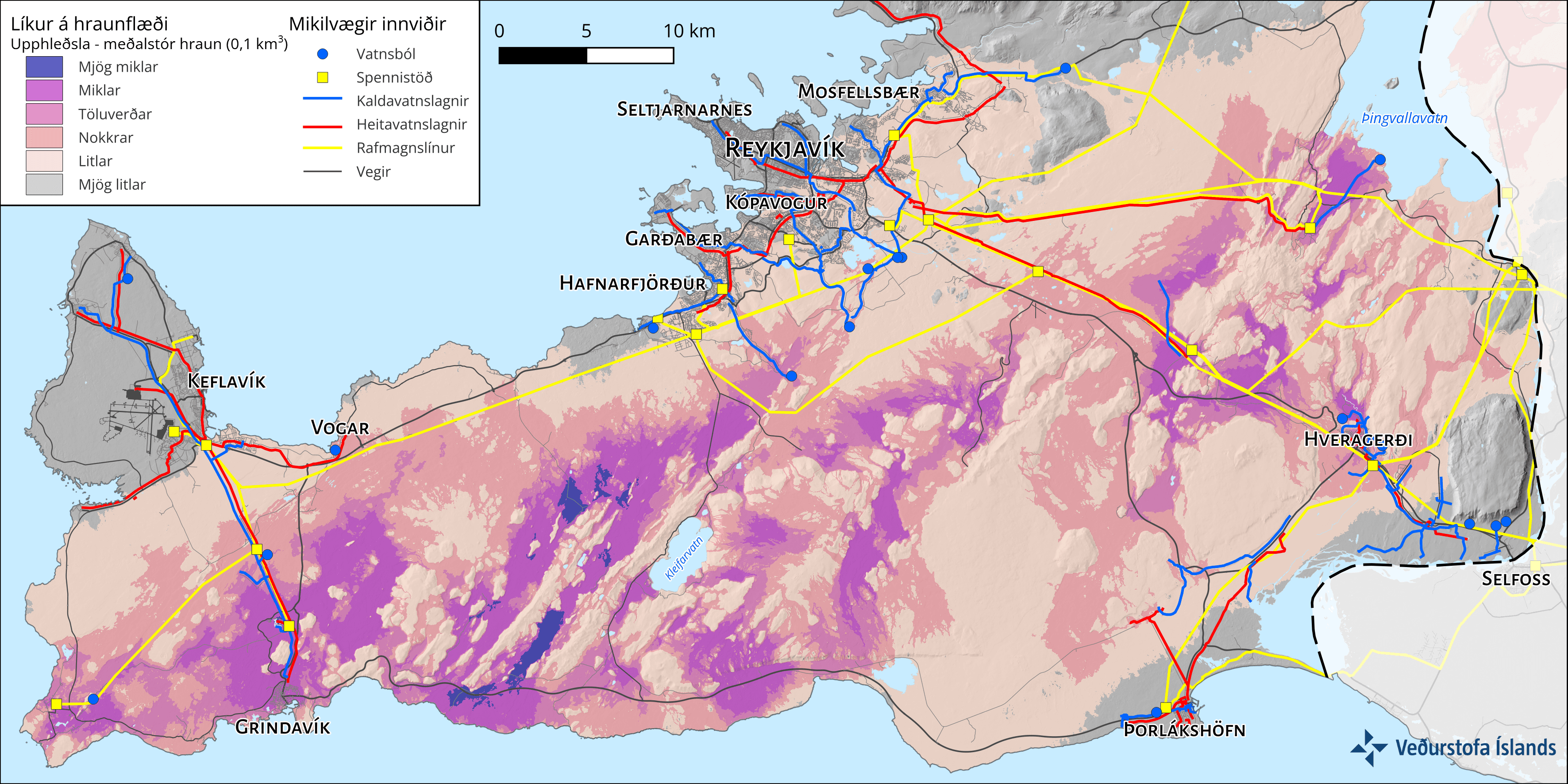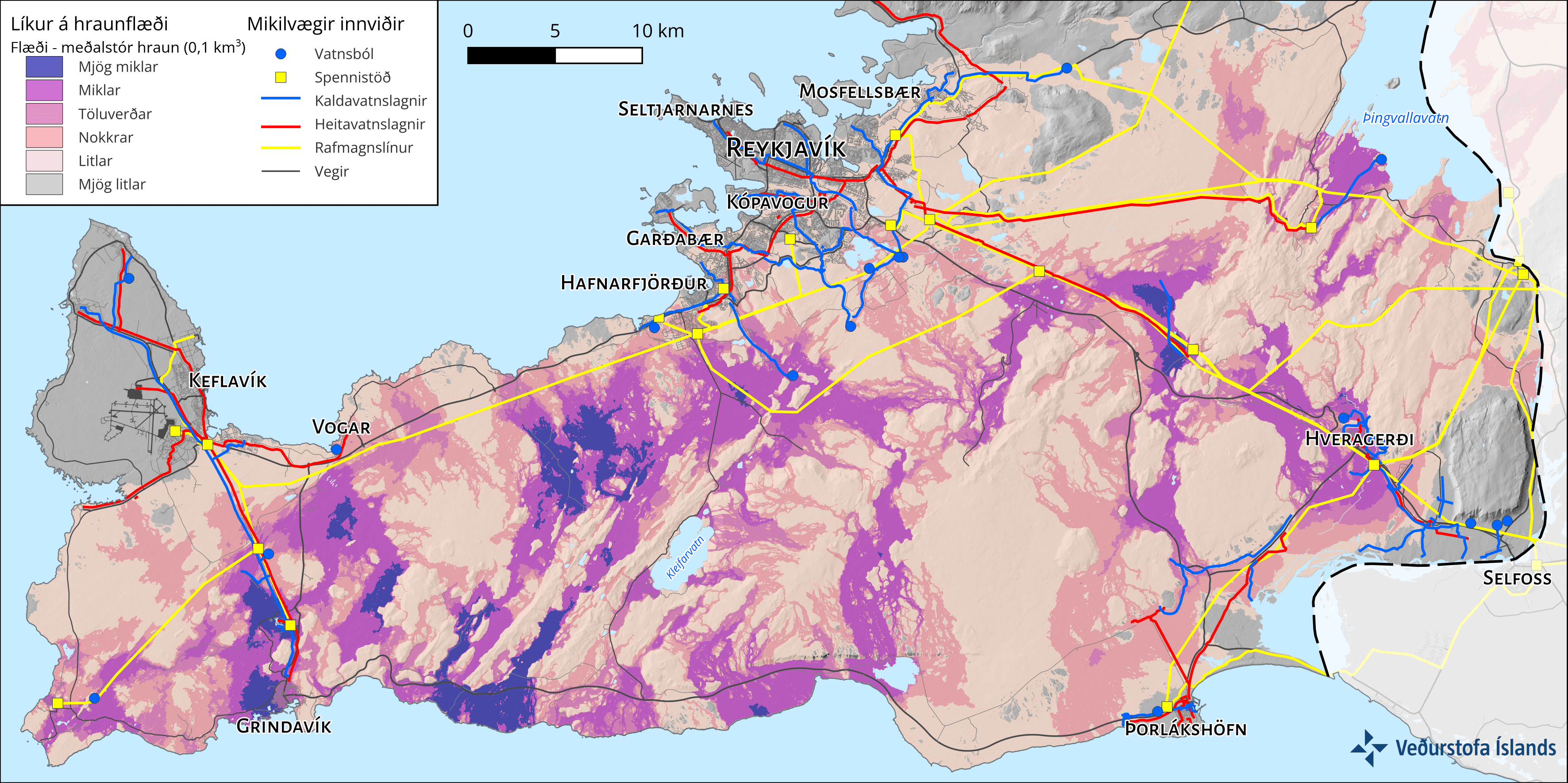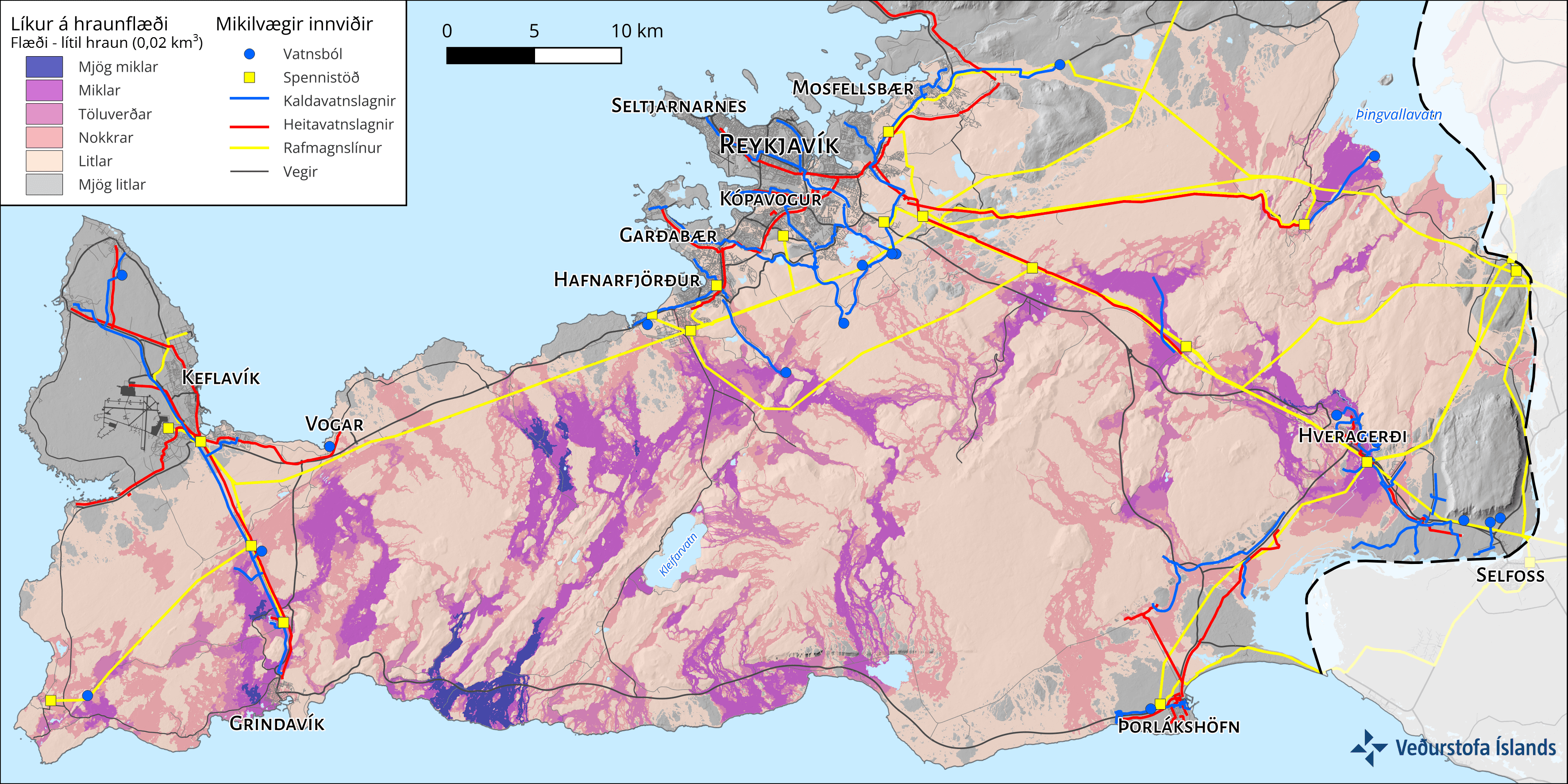 Líkur á gosupptökum á Reykjanesskaga samkvæmt MatHaz-líkaninu. Dekkri litir sýna meiri líkur og mikilvægir innviðir eru einnig sýndir á kortinu.