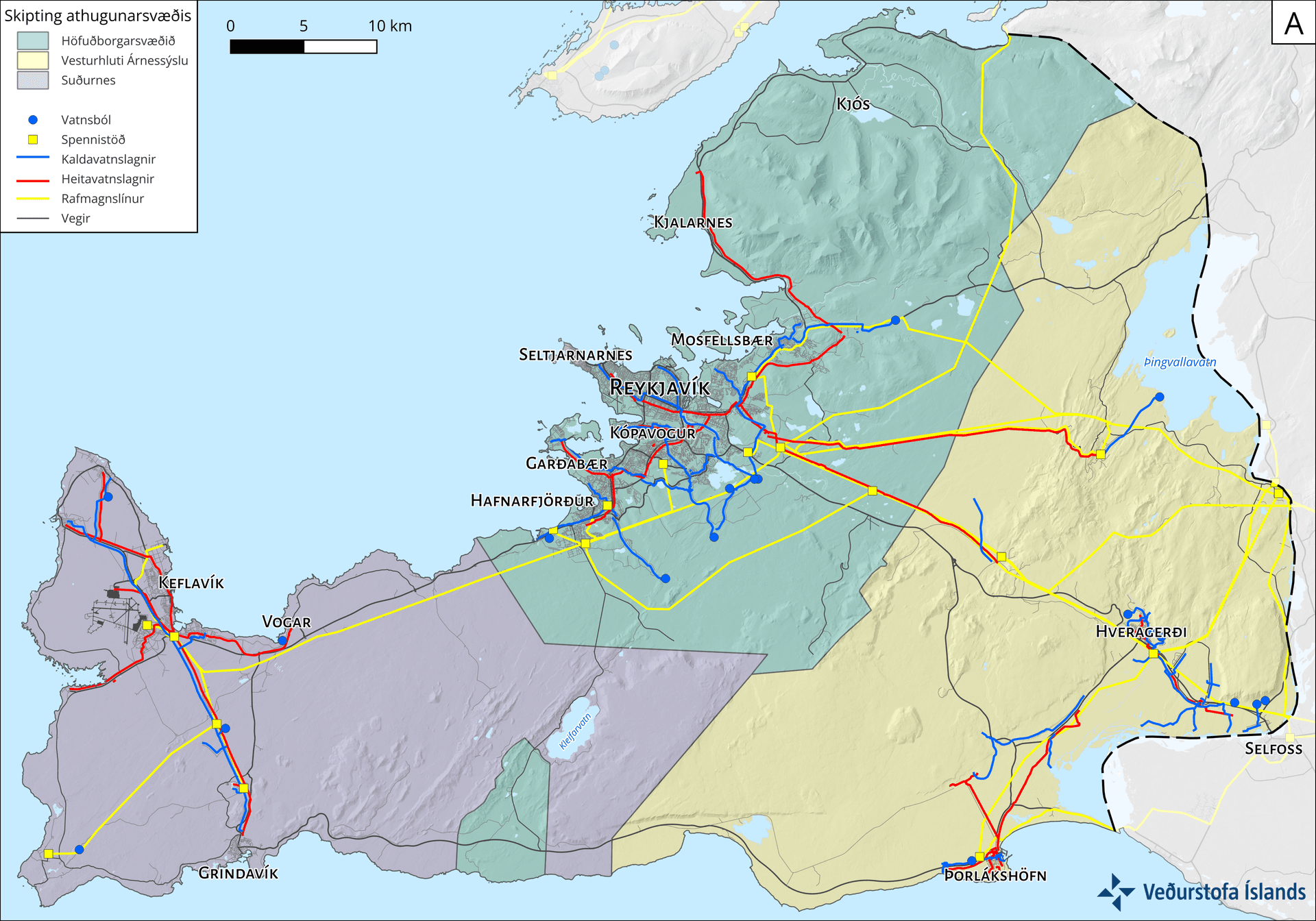 Reykjanesskagi eins og hann er afmarkaður í verkefninu og skipting svæðisins í þrjú undirsvæði: höfuðborgarsvæðið, vesturhluta Árnessýslu og Suðurnes.