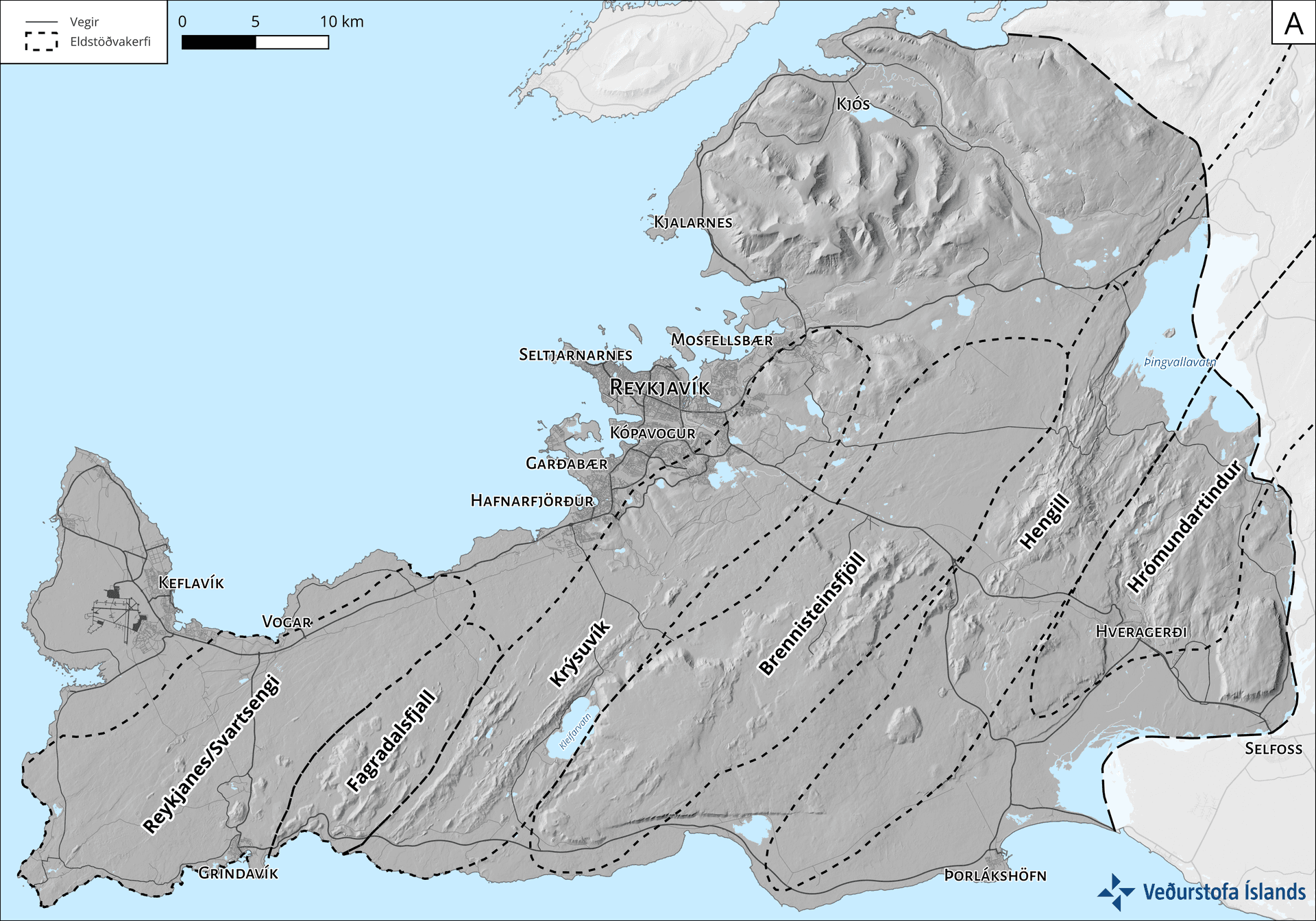 Athugunarsvæðið á Reykjanesskaga og sjö eldstöðvakerfi innan þess. Niðurstöður verkefnisins birtast í áföngum eftir váþáttum og svæðum.