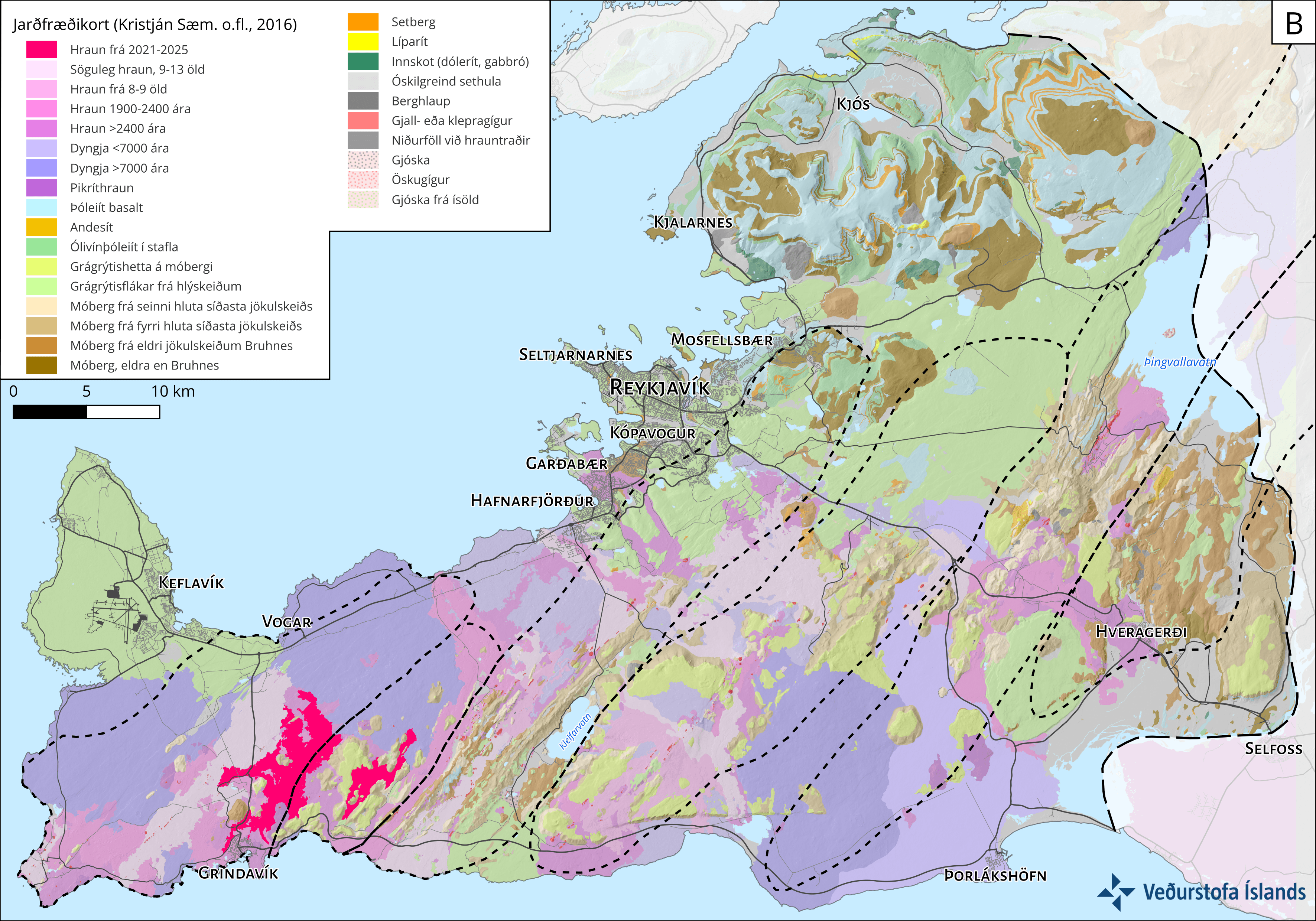 Jarðfræðikort af Reykjanesskaga sem notað er sem grunnur við túlkun jarðsögu og mat á eldfjallavá. Heimild: Kristján Sæmundsson o.fl. (2016).