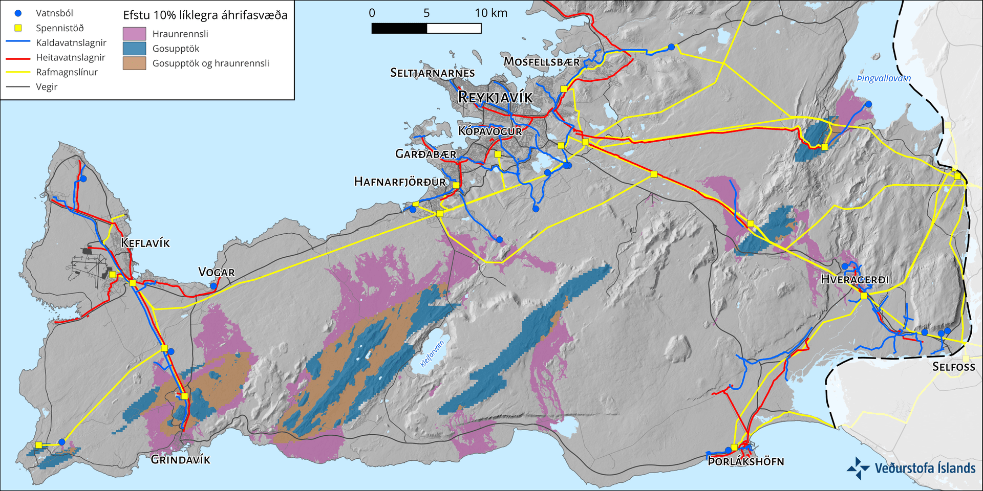 Grindavík og Hveragerði eru á svæðum á efsta hættustigi og eru meðal þeirra 10% svæða þar sem hraunavá er mest.