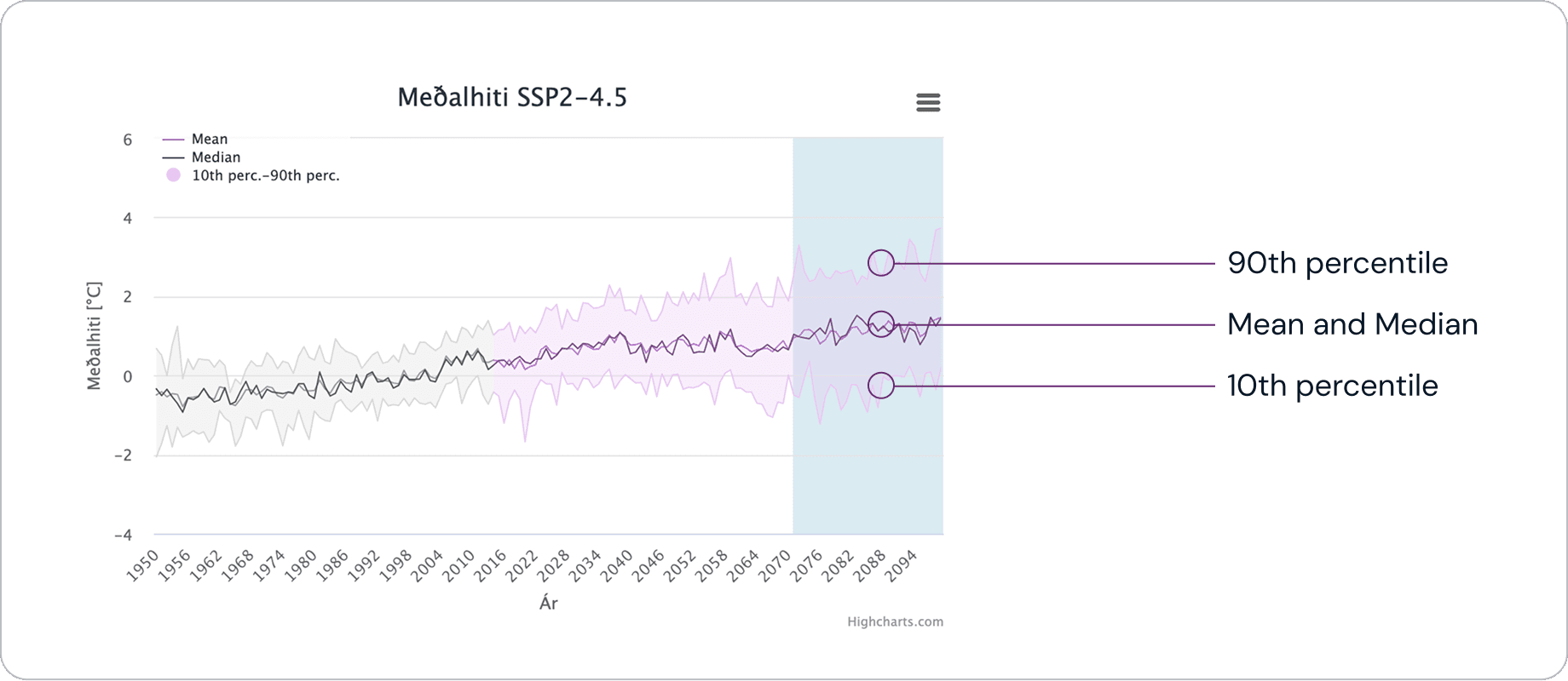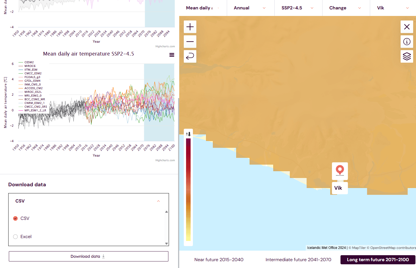 The tables below show CSV files containing figures for average temperatures in Vík for the year as a whole and scenario SSP2-4.5, on the one hand as summary statistics (mean, median, 10th and 90th percentiles) and on the other hand for all models.