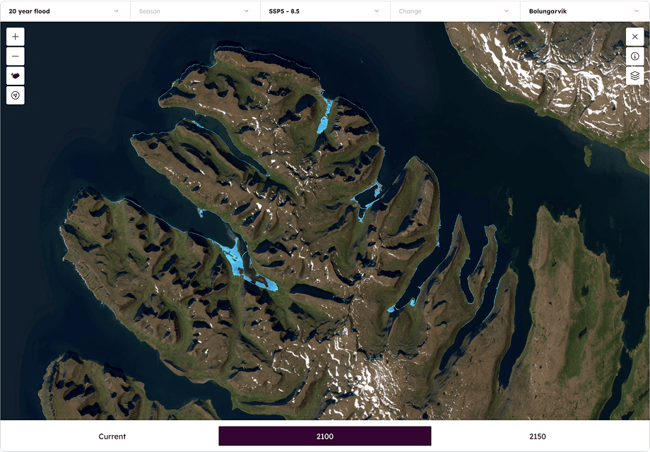 To visualize the flood extent in more detail and at specific locations, one can select a city/town from the area dropdown menu to get a zoomed in graph (see Figure 11). In this example, the 20-year flood extent for the scenario SSP5-8.5 for the year 2100 at Bolungarvík can be viewed in a side panel that appears upon the selection of the location.