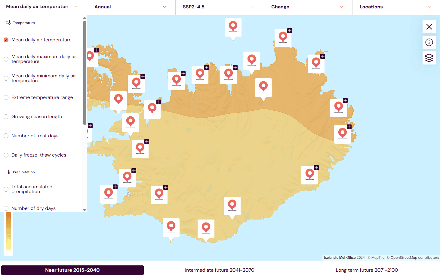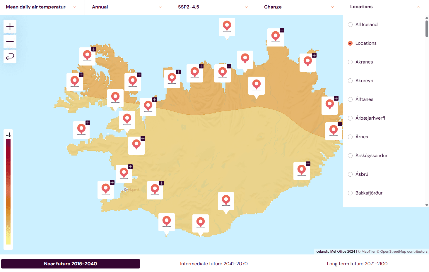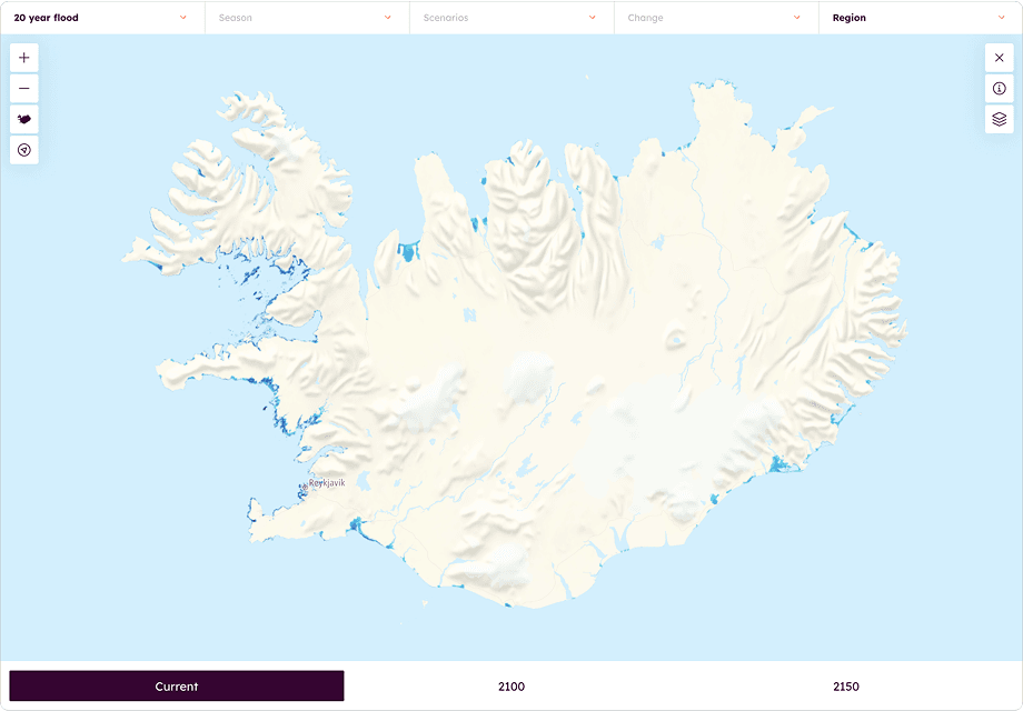 On the far right of the menu, where it says “region,” you can choose whether to view information for Iceland as a whole or for specific regions. The atlas can display data for 110 urban areas in Iceland regarding temperature and precipitation, and for 77 regions regarding coastal flooding.