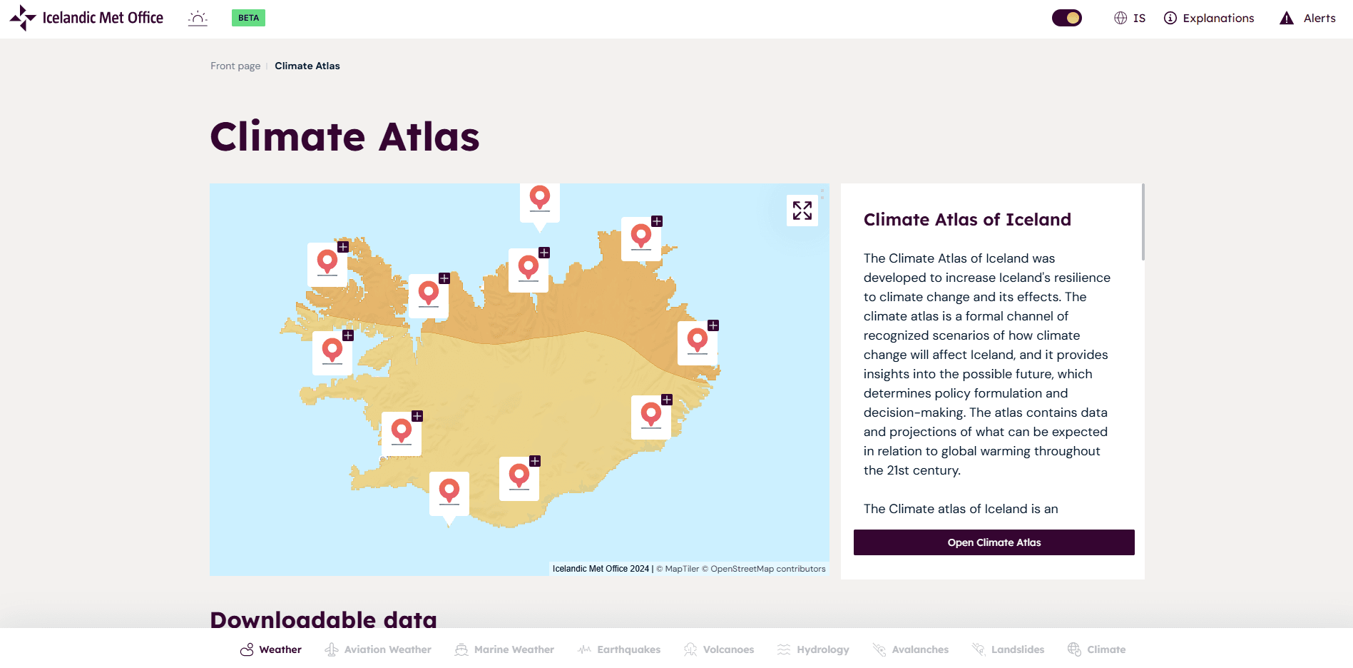 Figure 1 Screenshot of the start page of the Climate Atlas of Iceland.