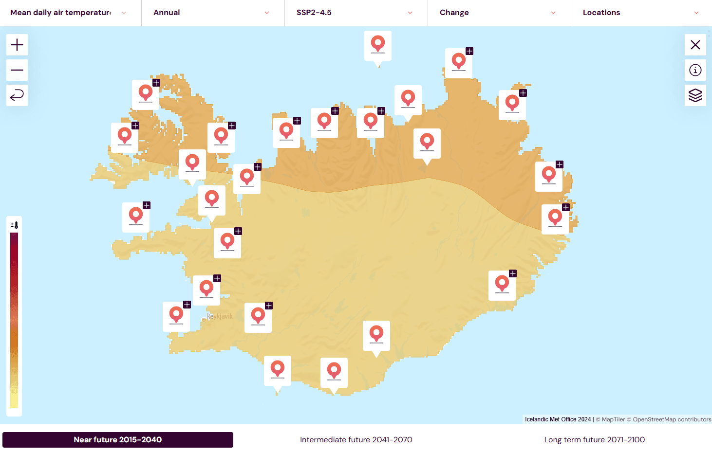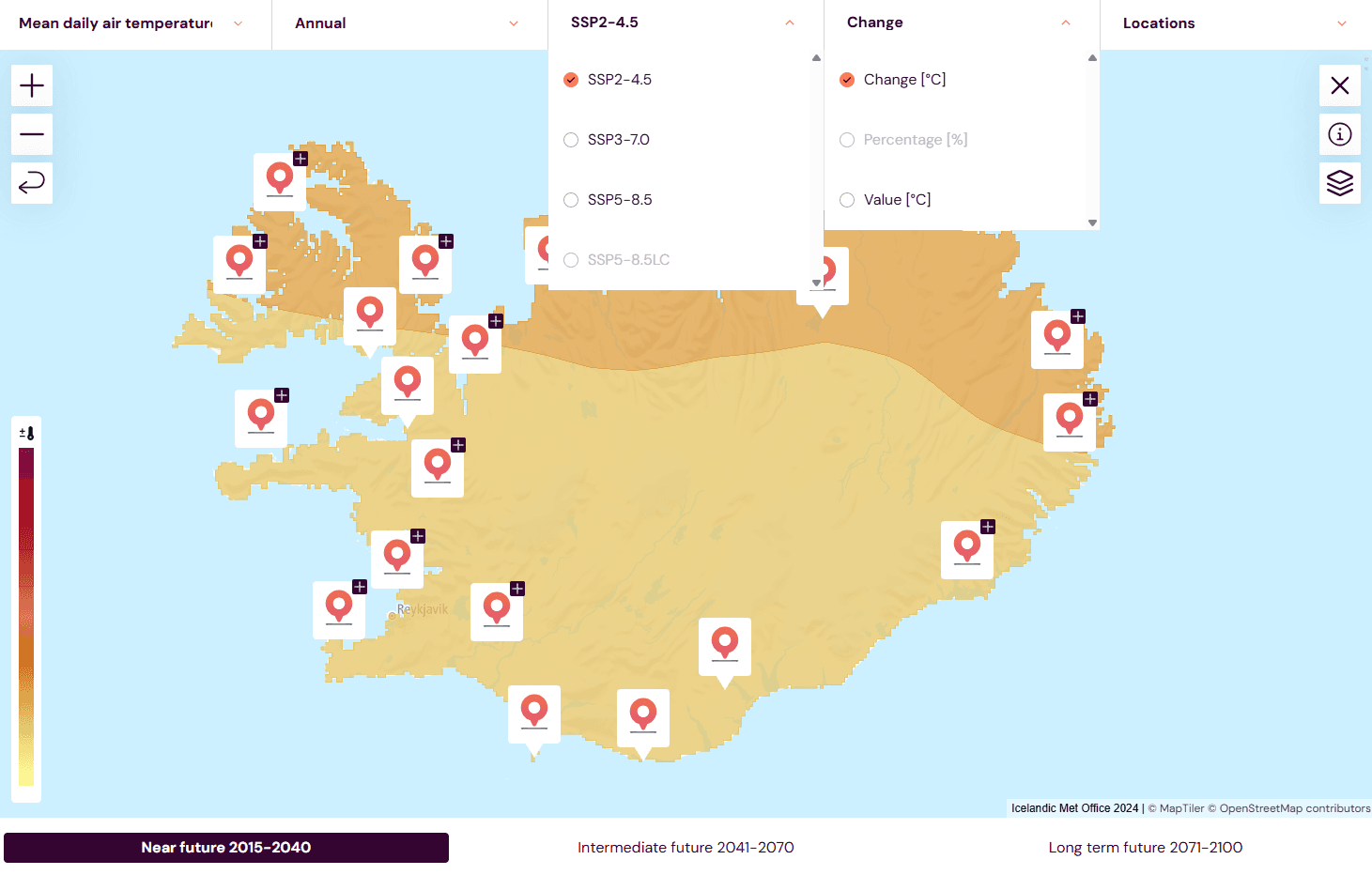 The Climate Atlas of Iceland is based on the scenarios defined by the United Nations’ Intergovernmental Panel on Climate Change (IPCC) for global greenhouse gas emissions. The data published in the atlas have been recalculated, adjusted, and downscaled for Iceland and the surrounding ocean. The atlas provides information on the impact of different emission scenarios on temperature, precipitation and sea level rise in Iceland by the end of the century. The data in the atlas is open and accessible to everyone. It can be viewed graphically through interactive features, as well as being downloadable in various formats.