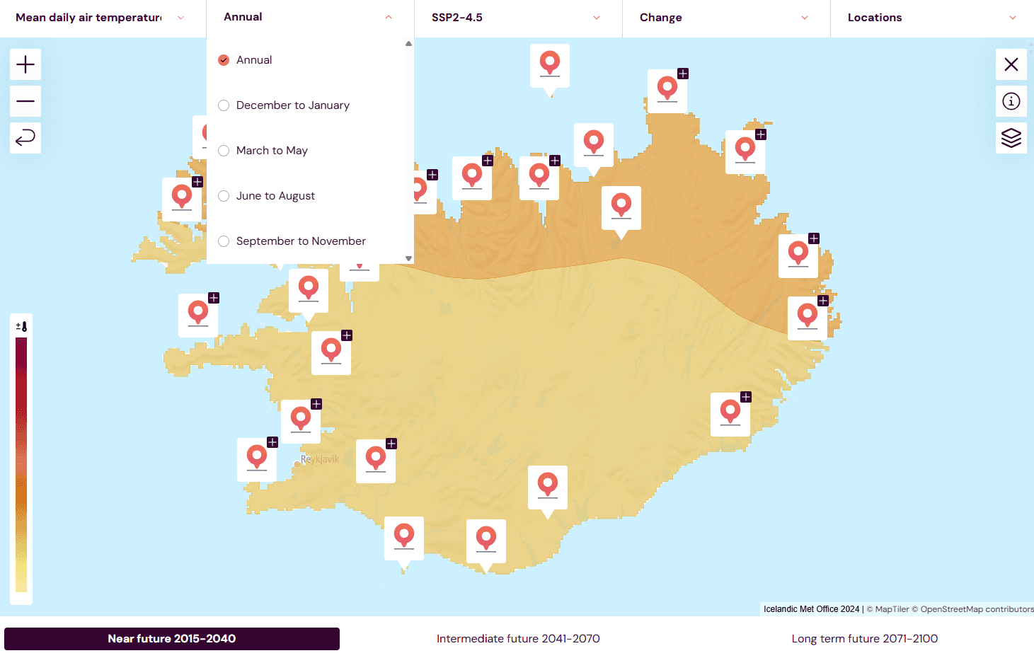 Once the atlas is open, the top panels include the dropdown menus from which one can select to visualize the climate variables/indicators annually or seasonally, for different scenarios, and at various locations around Iceland.