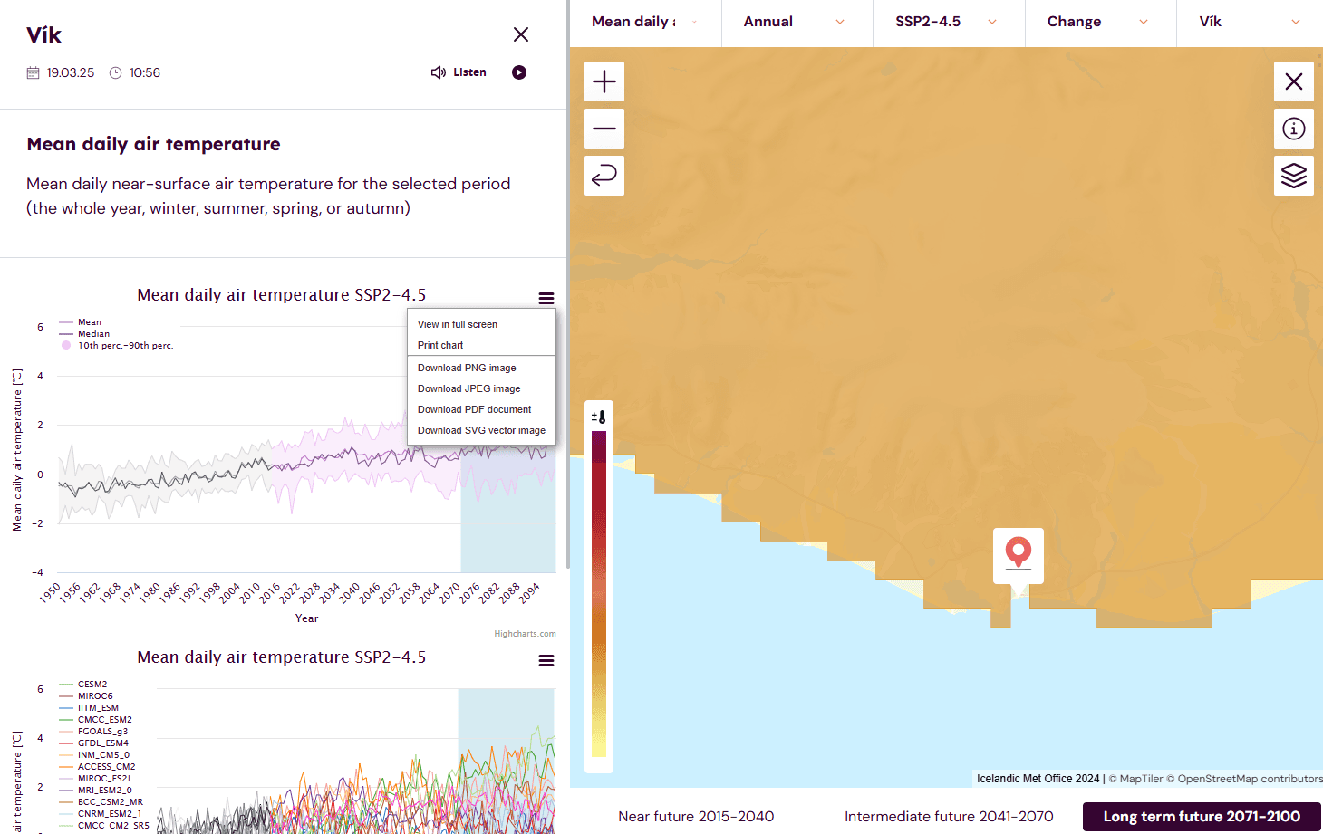 Figure 5 Screenshot showing the temporal evolution of the mean temperature in Vík as summary statistics (upper graph on the left), and for all the models (lower graph on the left). The mean temperature in Vík is shown for the whole year, and for the SSP2-4.5 scenario.