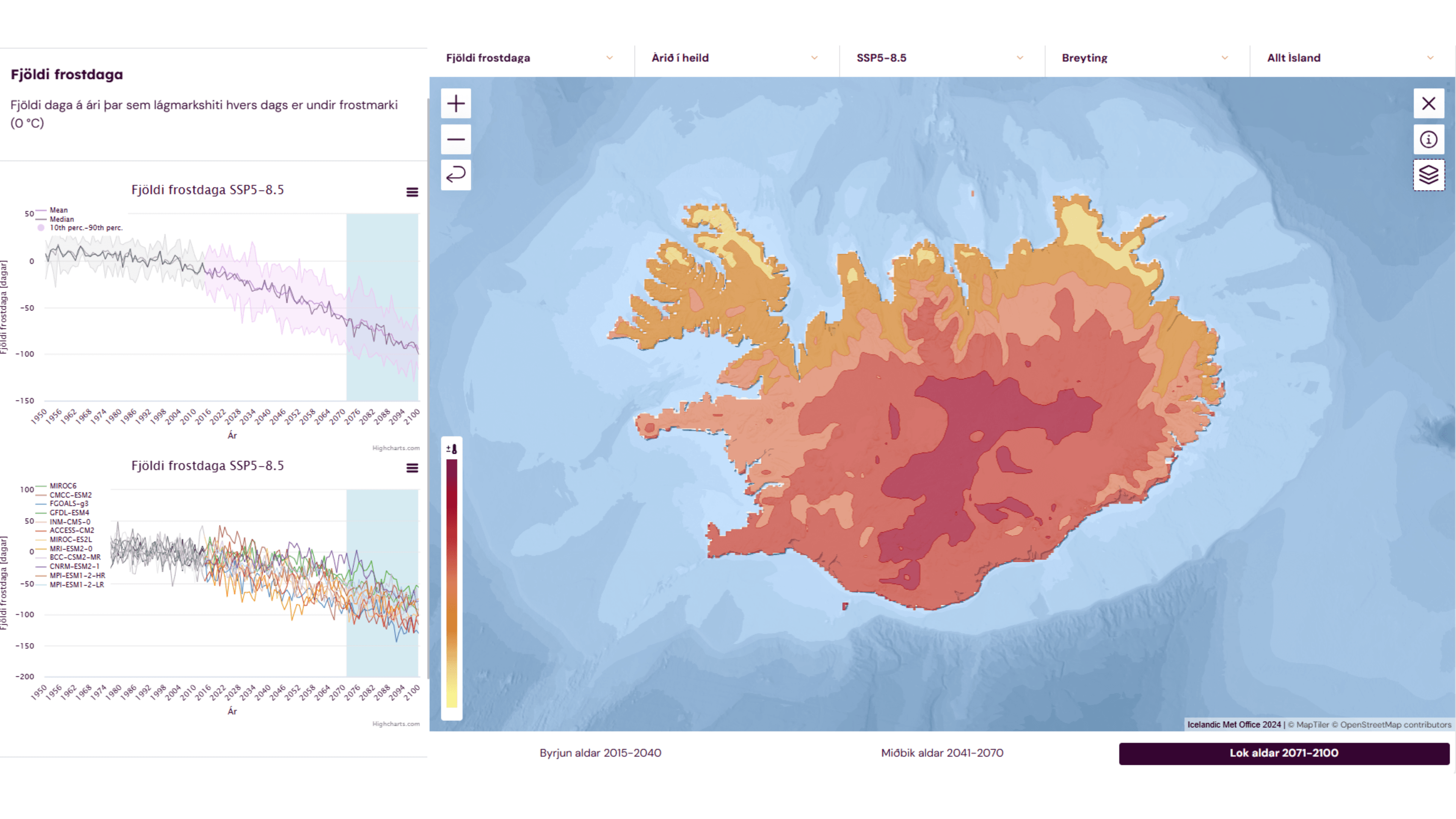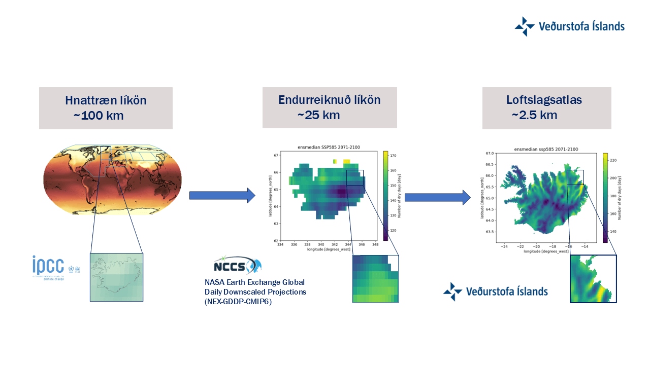 Loftslagsatlas Íslands hefur verið gerður aðgengilegur á nýjum vef Veðurstofu Íslands. Atlasinn veitir innsýn inn í hvernig loftslag á Íslandi gæti þróast og breyst til loka aldarinnar. Gögnin út atlasnum er hægt að nýta á ýmsan máta til þess að meta viðkvæmni samfélaga gagnvart loftslagsbreytingum og mögulegar áhættur sem þeim fylgja. Atlasinn er þannig mikilvægt verkfæri til að styðja við stefnumótun og ákvarðanatöku í tengslum við aðlögun að loftslagsbreytingum með breytta framtíð í huga.
