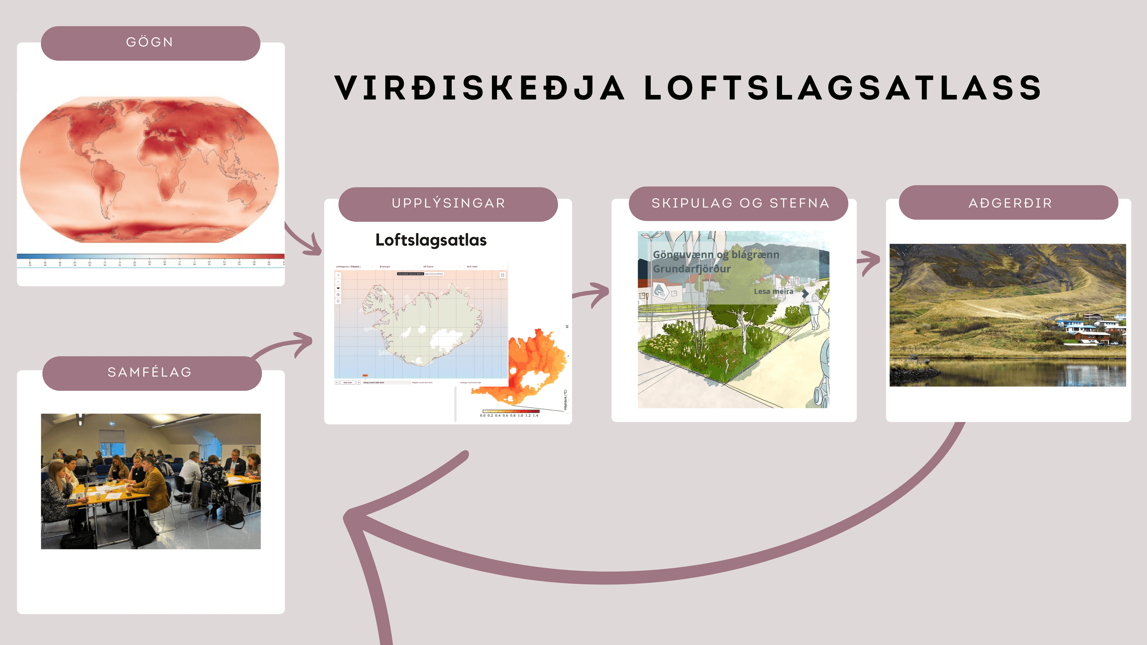 Myndin gefur yfirsýn yfir virðiskeðju Loftslagsatlass Íslands. Fyrirliggjandi gögn um áhrif loftslagsbreytinga eru eru gerð aðgengileg með atlasnum. Þessi gögn er hægt að nota til þess að móta stefnu og skipulag. Skipulagsákvarðanir leiða af sér aðgerðir sem taka mið af breyttri framtíð. Aðgerðirnar skila sér til samfélagsins sem á að lokum í samtali um framþróun atlasins.