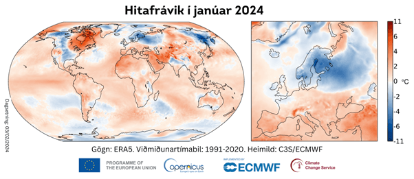 Mynd 1 Hitafrávik í janúar 2024 í samanburði við viðmiðunartímabilið 1991-2020. Gögn frá ERA5. Heimild: Copernicus Climate Change Service/ECMWF.