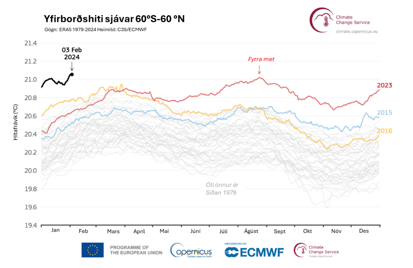 Mynd 2: Meðal hitafrávik (°C) á hafsvæði utan heimskautssvæðanna (60°N-60°S) fyrir 2015 (blá lína), 2016 (gul lína), 2023 (rauð lína og 2024 (svört lína). Öll önnur ár milli 1979 og 2022 eru sýnd með gráaum línum. Gögn frá ERA5 . Heimild: Copernicus Climate Change Service/ECMWF.