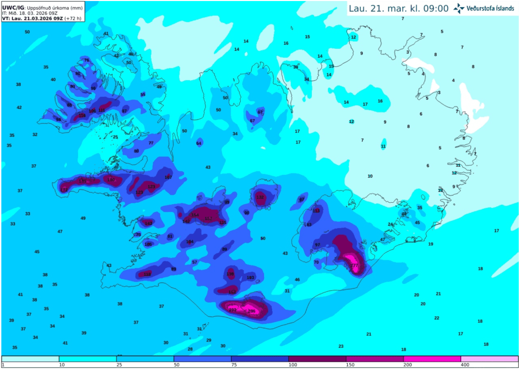 Veðurspáin gerir ráð fyrir sunnan hvassviðri eða stormi sem kemur upp að vesturströnd landsins í kvöld, miðvikudaginn 18. mars. Aðfaranótt fimmtudagsins 19. mars koma skilin inn að landinu með hlýindum og talsverðri úrkomu samfara hvassviðrinu. Úrkoman verður að mestu í formi rigningar á láglendi vegna hlýindanna. Framan af verður þó snjókoma eða slydda til fjalla, en þegar líður á daginn má búast við rigningu upp í um 450 m h.y.s.