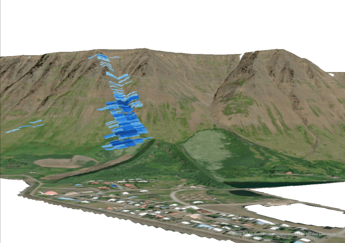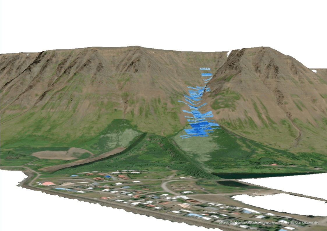 Ratsjármynd af snjóflóðinu í Innra-Bæjargili