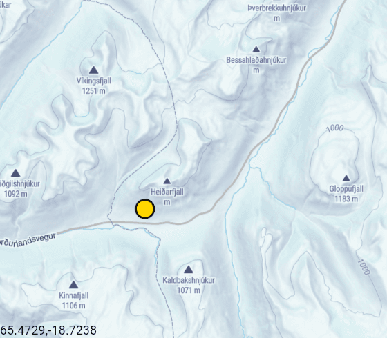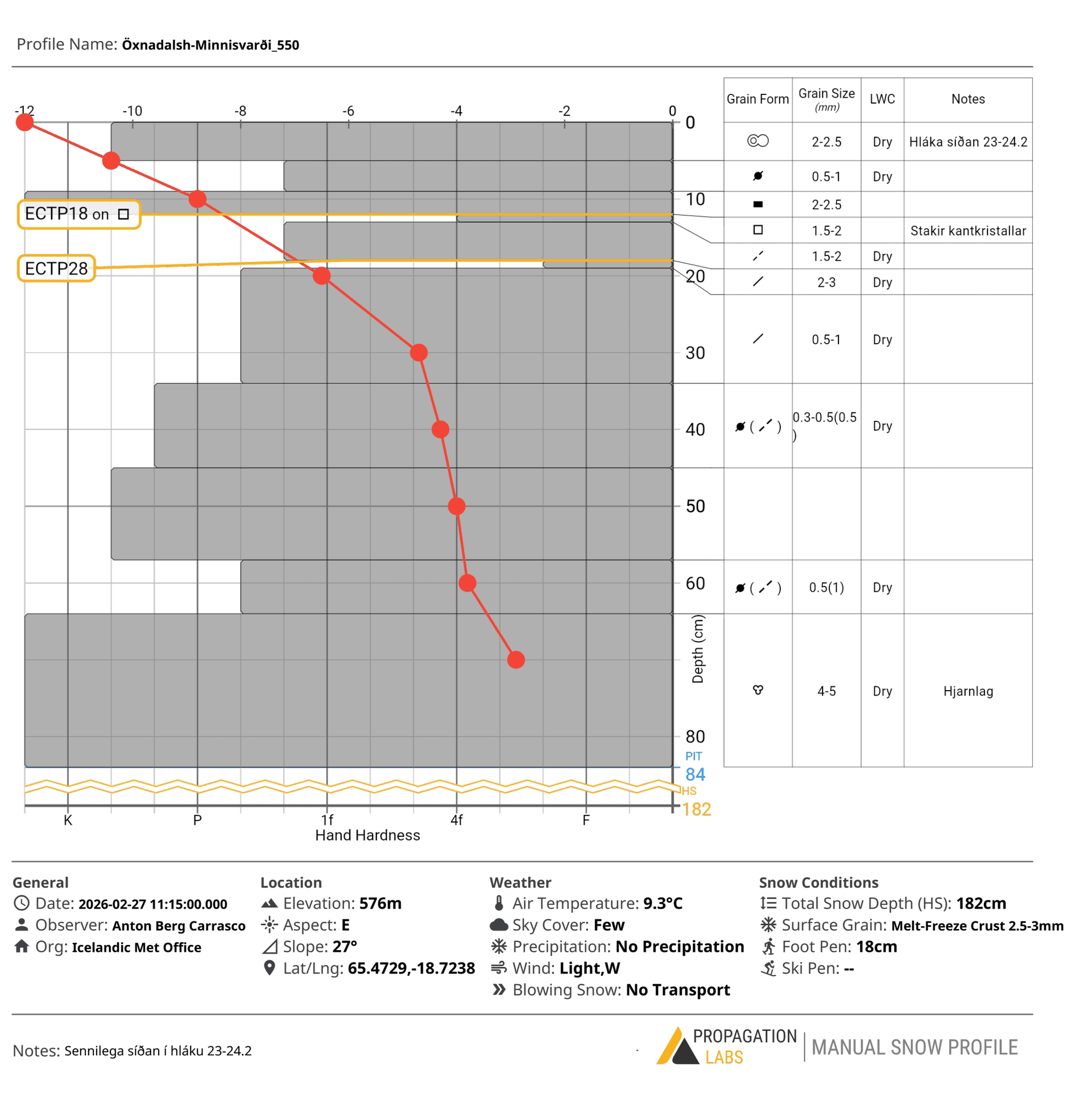 Í gær 27.2. var snjógryfja tekin uppi á Öxnadalsheiði í austlægu viðhorfi í 576m hæð. Snjóþekjan var 182 cm djúp og gryfjan 84 cm. Veikt lag með köntuðum kristöllum fannst neðan við hjarn og vindfleka á um 12 cm dýpi. Lagið brotnaði og breiddist út við 18 slög í útvíkkuðu samþjöppunarprófi. Annað veikt lag fannst á 18 cm dýpi og gaf það útbreitt brot á 28 slögum.