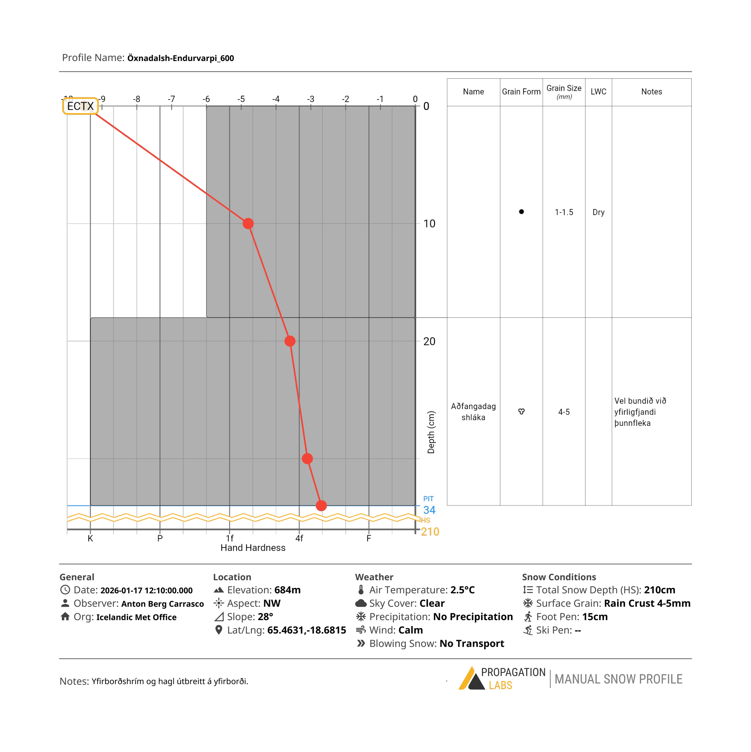 Snjógryfja var gerð í Heiðarfjalli á Endurvarpi þann 17. janúar. Gryfjan var gerð í u.þ.b. 680 m hæð í NV-vísandi hlíð. Gryfjan var um 34 cm djúp en heildarsnjódýpt á þessum stað var um 210 cm. Hitastigull var brattur efst í snjóþekjunni en svo nokkuð jafn niður á u.þ.b. 10 cm. Gryfjan sýndi vindfleka ofan á frosnu aðfangadagshláku lagi. Gert var útvíkkað samþjöppunarpróf. Prófið sýndi engin veik lög. Snjór er almennt talinn stöðugur.