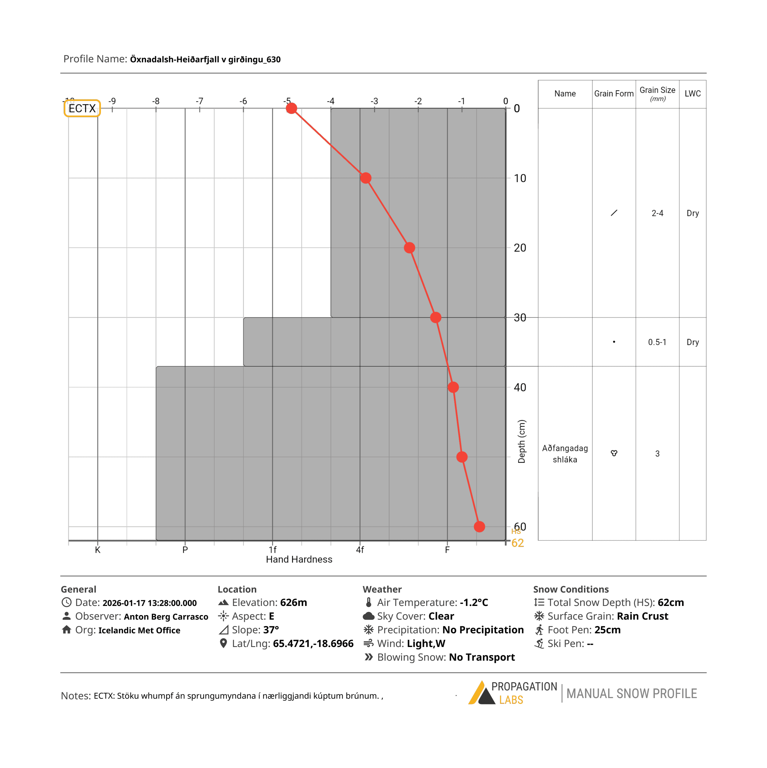 Snjógryfja var gerð í Heiðarfjalli á Öxnadalsheiði þann 17. janúar. Gryfjan var gerð í u.þ.b. 626 m hæð í A-vísandi hlíð. Gryfjan var um 60 cm djúp en heildarsnjódýpt á þessum stað var um 62cm. Hitastigull var frekar brattur efst í snjóþekjunni (u.þ.b. 20 cm) en minni neðar. Gryfjan sýndi niðurbrotið lag (30 cm þykkt) ofan á harðari vindfleka. Þar fyrir neðan var frosið aðfangadagshláku lagi. Gert var útvíkkað samþjöppunarpróf. Próið sýndi engin veik lög. Snjór er almennt talinn stöðugur.