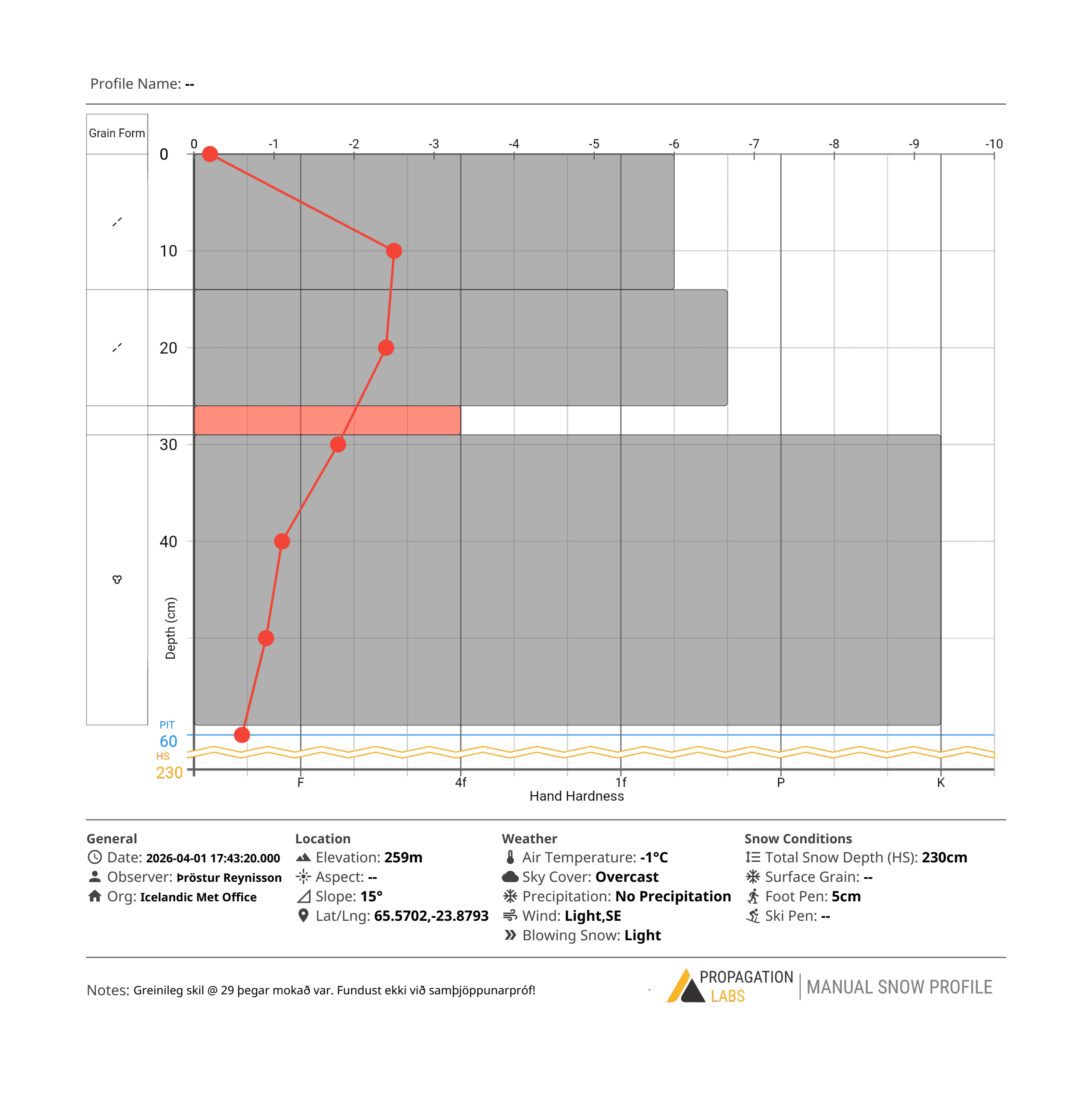 Snjógryfja í brekkunni við gamla skíðaskálann sýndi lítil merki um óstöðugleika. Það var eitt þéttara lag af vindbrotnum snjó, 27 cm. Engin stöðugleikapróf voru gerð.