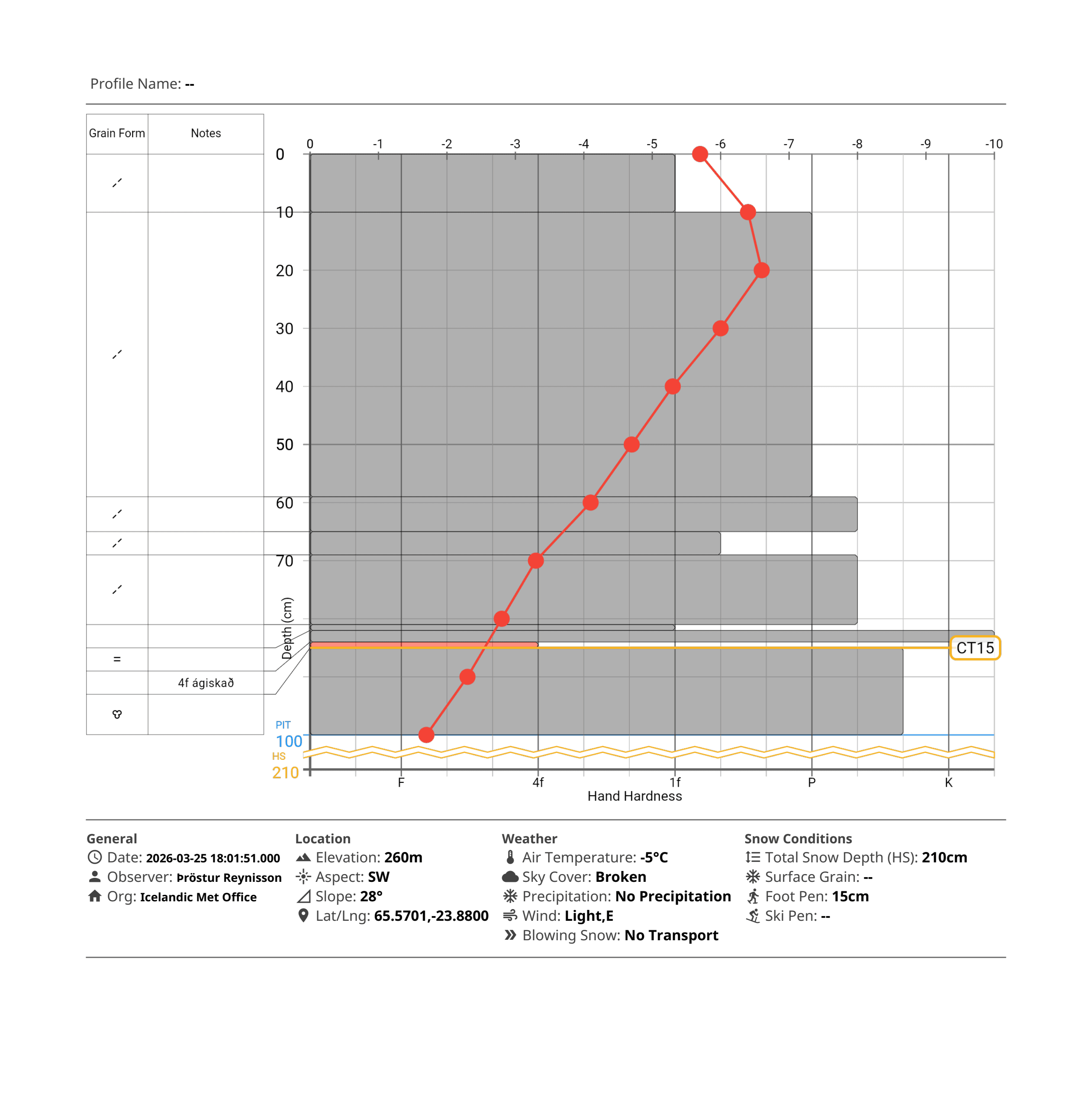 Snjógryfja í brekkunni við gamla skíðaskálann sýndi svolitla lagskiptingu og veikt lag sem brast við miðlungs álag og gaf slétt brot með viðnámi. Göngufæri er frekar erfitt, víðast hvar er hjarnskel sem brotnar þegar gengið og gjarnan laus snjór undir.