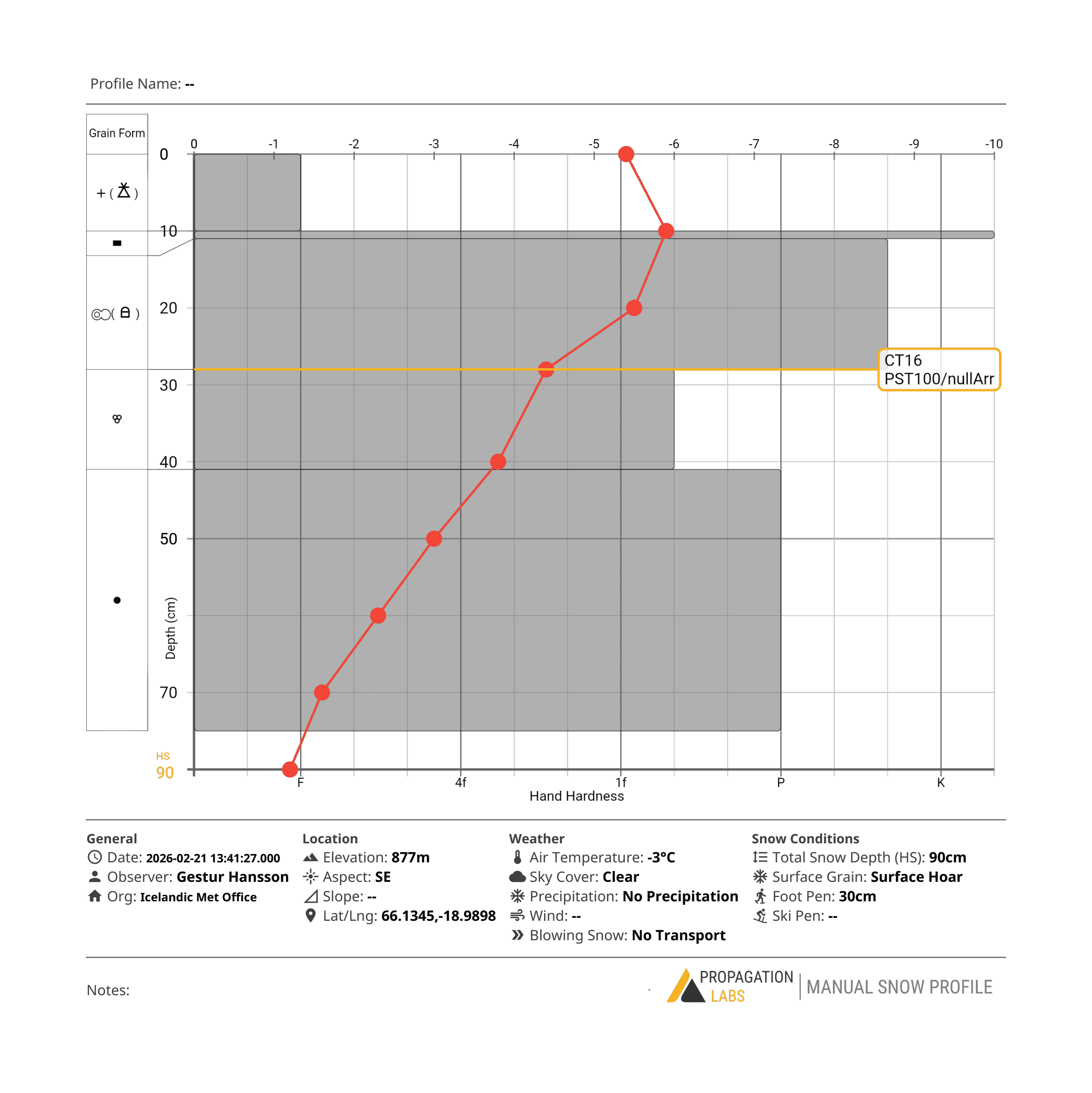 Snjógryfja var tekin í um 877m hæð undir Illviðrishnjúki við Siglufjörð í SA vísandi hlíð. Gryfjan sýnir um 10cm þykka lausamjöll ofan á þunnu íslagi og lagskiptan snjó undir. Stöðugleikapróf gaf brot á 30cm dýpi við miðlungs álag, milli tveggja fleka. Skíðamenn hafa tilkynnt vúmp hljóð í Skarðsdal og veikleikar hafa einnig fundist á Flateyjarskaga. Í dag féll náttúrulegt flekaflóð í Hvanneyrarskál ofan Siglufjarðar sem var með um 200m langt brotstál. Ljóst er að veikleikar eru víða á Tröllaskaga og Norðurlandi og er útivistafólk beðið um að fara varlega.