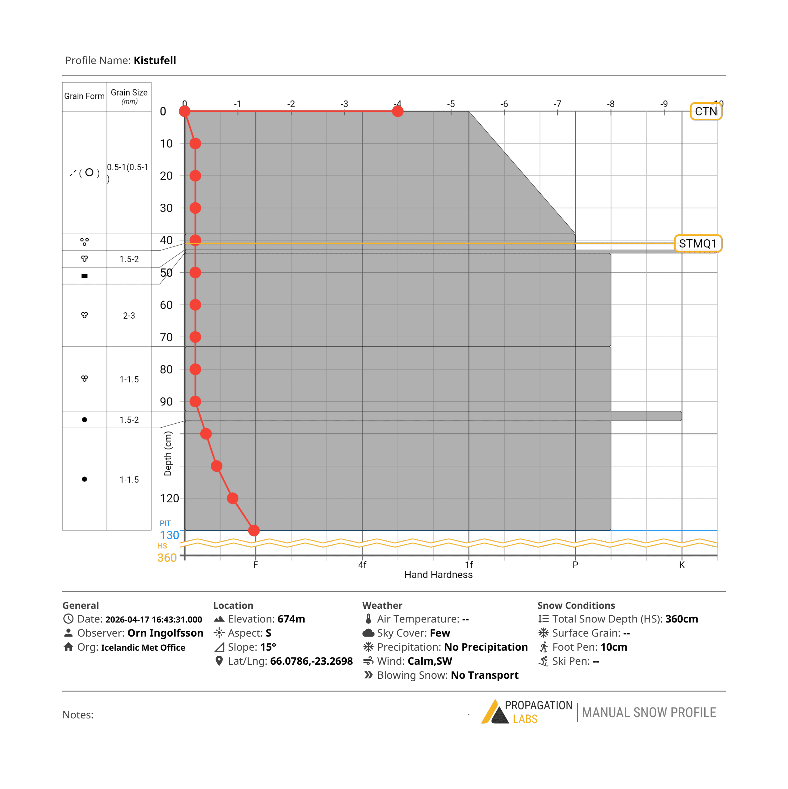 Snjógryfja var gerð í Kistufelli í gær 17. apríl í 670 m hæð og suðurvísandi brekku. Hún sýndi stífan jafnhita snjó, sem þó var enn aðeins lagskiptur. Það var 3 cm þykkt krapalag á 40 cm dýpi og þunnt íslag rétt fyrir neðan. Stöðugleikapróf gáfu ekki svörun en skoplapróf gaf slétt brot við miðlungs átak.