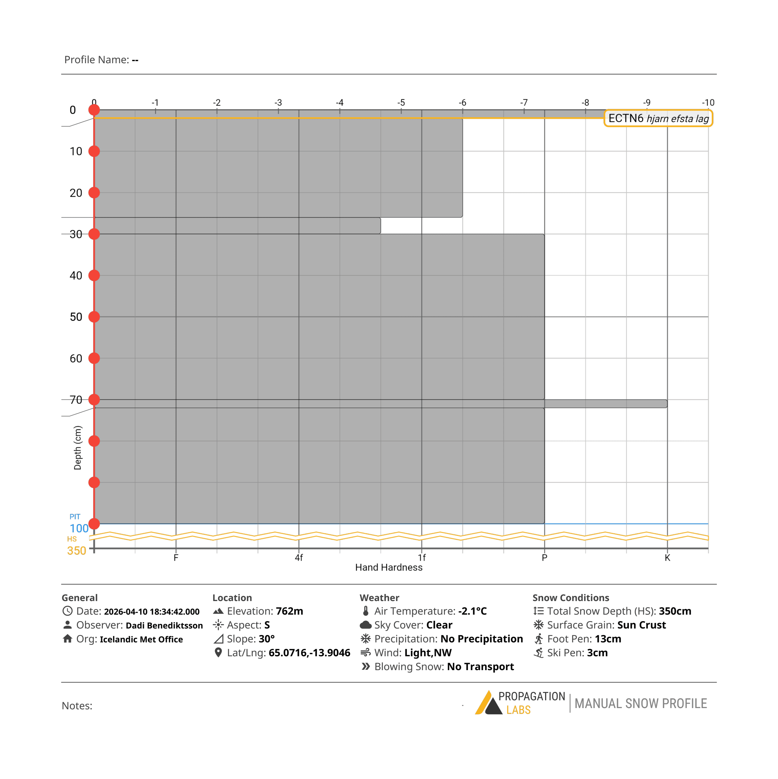 Snjógryfja var gerð í Oddsskarði í gær 10. apríl í 760 m hæð og suðurvísandi brekku. Hún sýndi stífan jafnhita snjó, sem þó var enn aðeins lagskiptur. Ofan á var hörð þunn skel sem brotnaði auðveldlega. Stöðugleikapróf gáfu ekki svörun á öðrum stöðum neðar í snjóþekjunni.