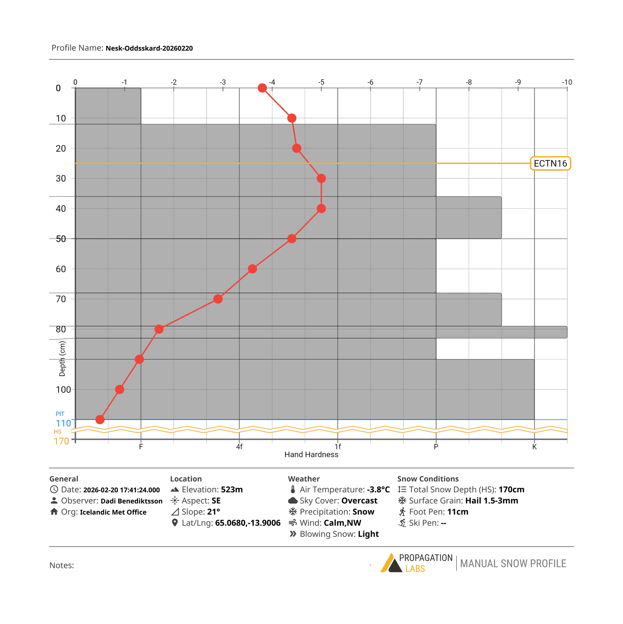 Snjógryfja var tekin við skíðasvæðið í Oddsskarði seinnipart 20. janúar. Hún sýndi stífan, nokkuð einsleitan og vel samanbundinn snjó, með rúmlega 10 cm af lausamjöll ofan á. Útvíkkað samþjöppunarpróf gaf brot við miðlungs álag á 25 cm dýpi en það breiddi ekki úr sér.