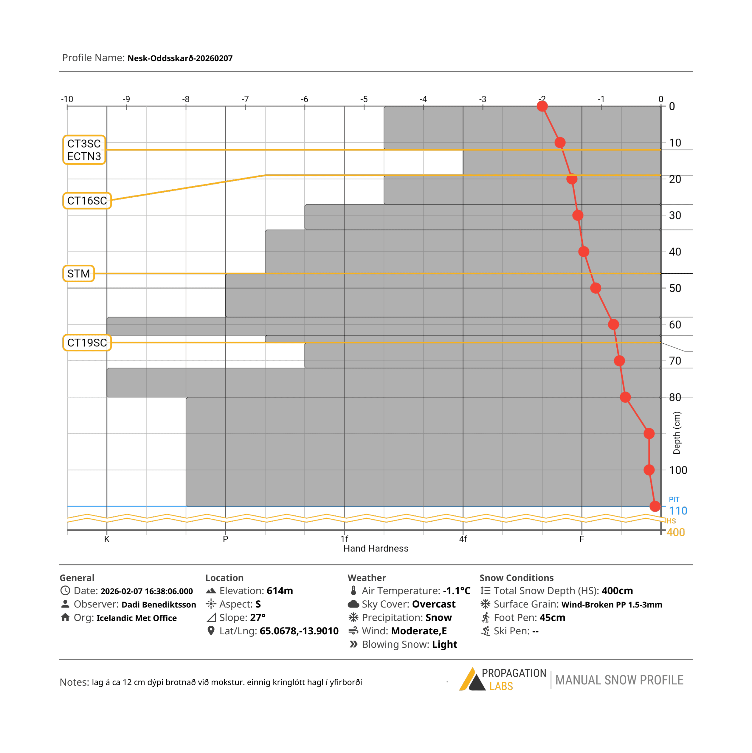 Athugið að snjógryfjur eru einungis vísbending um stöðugleika snævar á einum stað og nauðsynlegt að hafa aðgát þegar ferðast er um í brattlendi, gera eigin athuganir og/eða forðast snjóflóðalandslag.