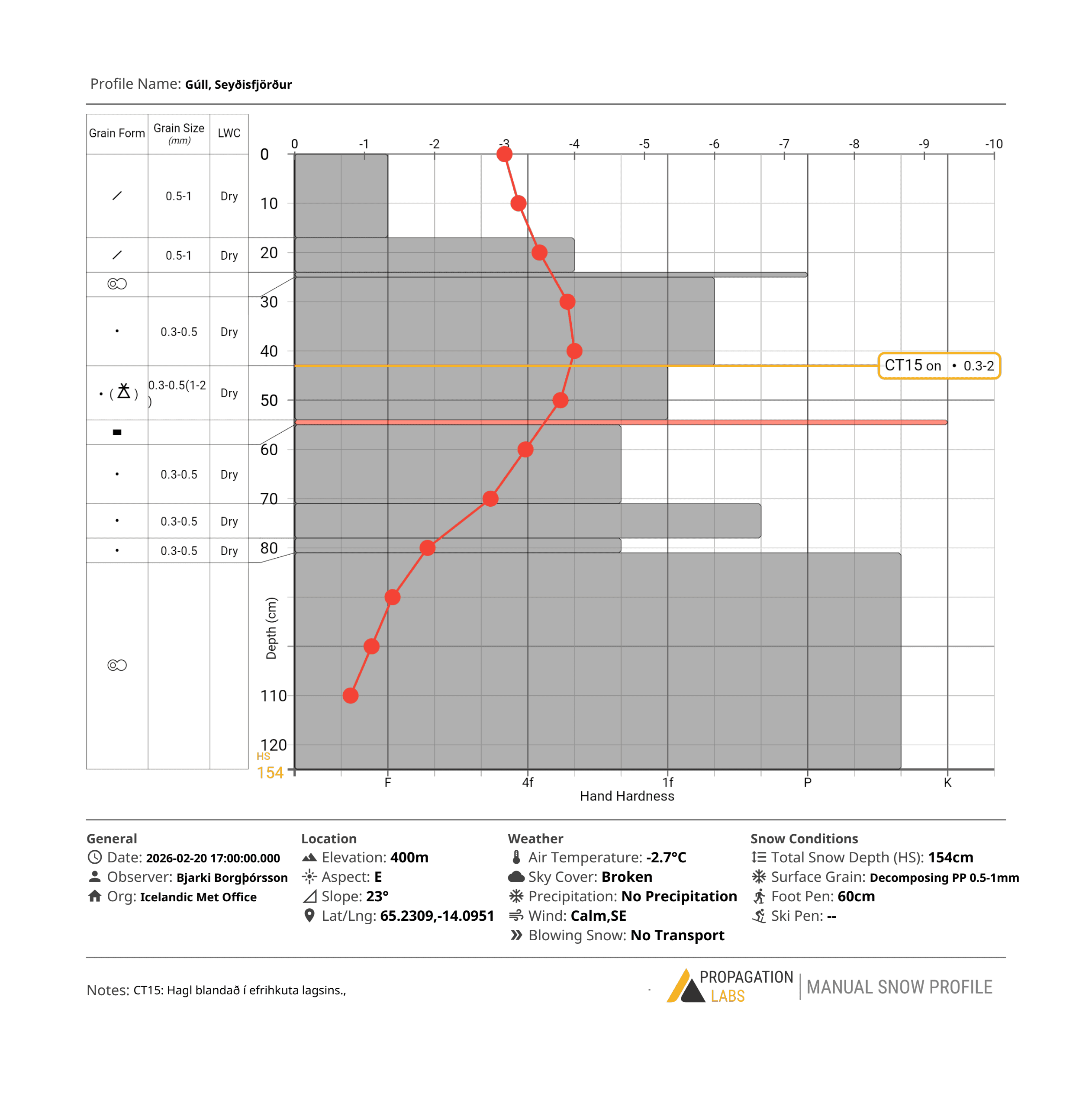 Snjógryfja var tekin við Gúll í Stafdal seinnipart 20. janúar. Gryfjan var tekin í 400m hæð í austurvísandi hlíð. Hún sýndi lagskiptan snjó ofan á stífu hjarni með um 10 cm af lausasnjó ofan á og á um 50cm dýpi var þunnt íslag. Stöðugleika próf gaf brot við miðlungs álag á 40 cm dýpi og mátti sjá hagl í brot laginu. Nokkur flóð hafa fallið á svæðinu í um 700-800 m hæð sem bendir til að veikleikar eru víðar ofar til fjalla.