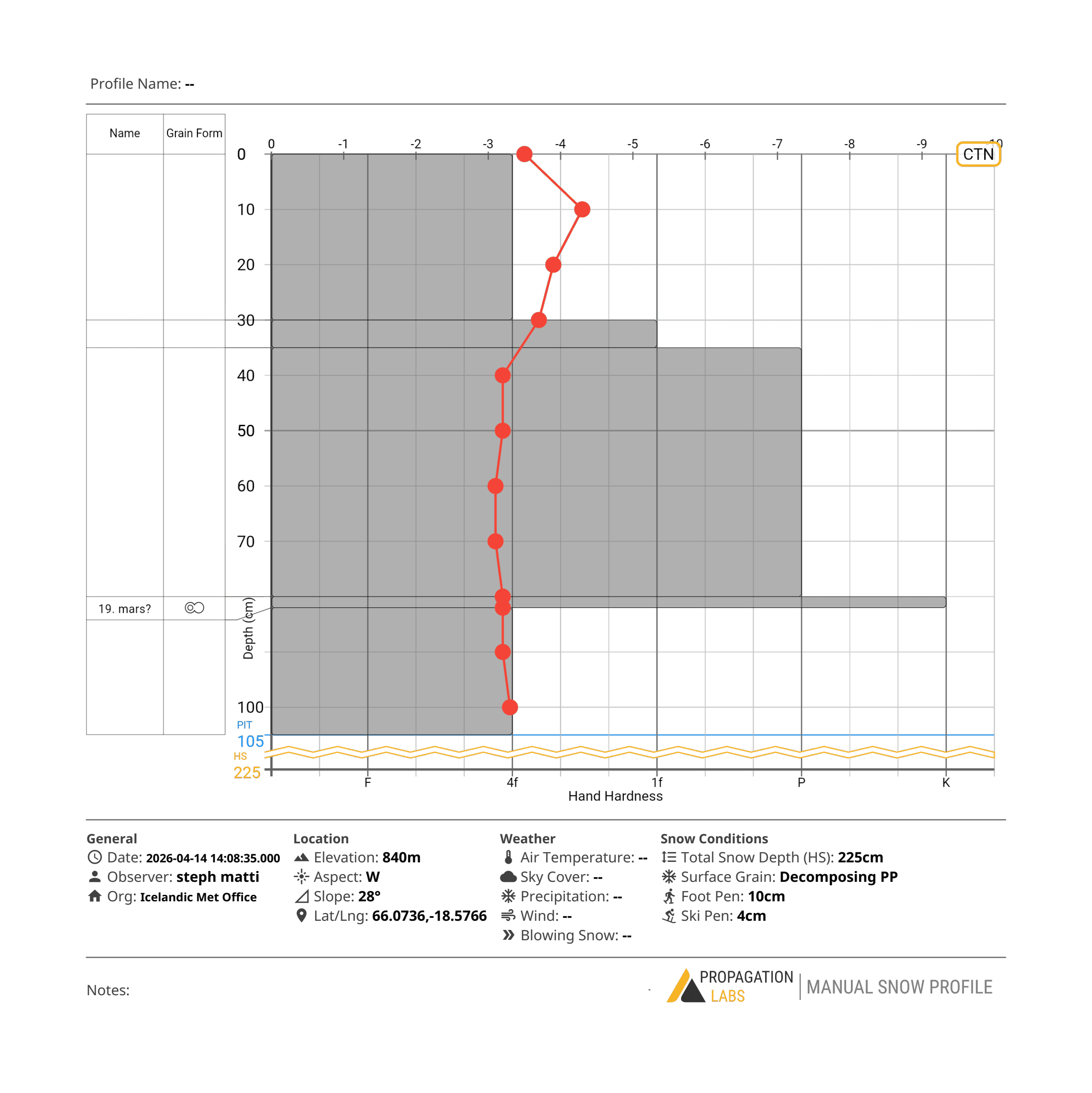 Gryfja í 840 m hæð og vesturvísandi brekku á Múlakollu sýndi þéttan lagskiptan snjó. Snjórinn var almennt í voraðstæðum og einsleitur. Skari var á 80 cm dýpi og mjúkur snjór þar undir. Talsverð umferð skíðamanna var í dalnum en engin nýleg snjóflóð sáust. Samþjöppunarpróf gaf ekki svörun. Mörg lausasnjóflóð féllu á Tröllaskaga 13. apríl í hlýindum og sólskini eftir snjókomu 12. apríl.