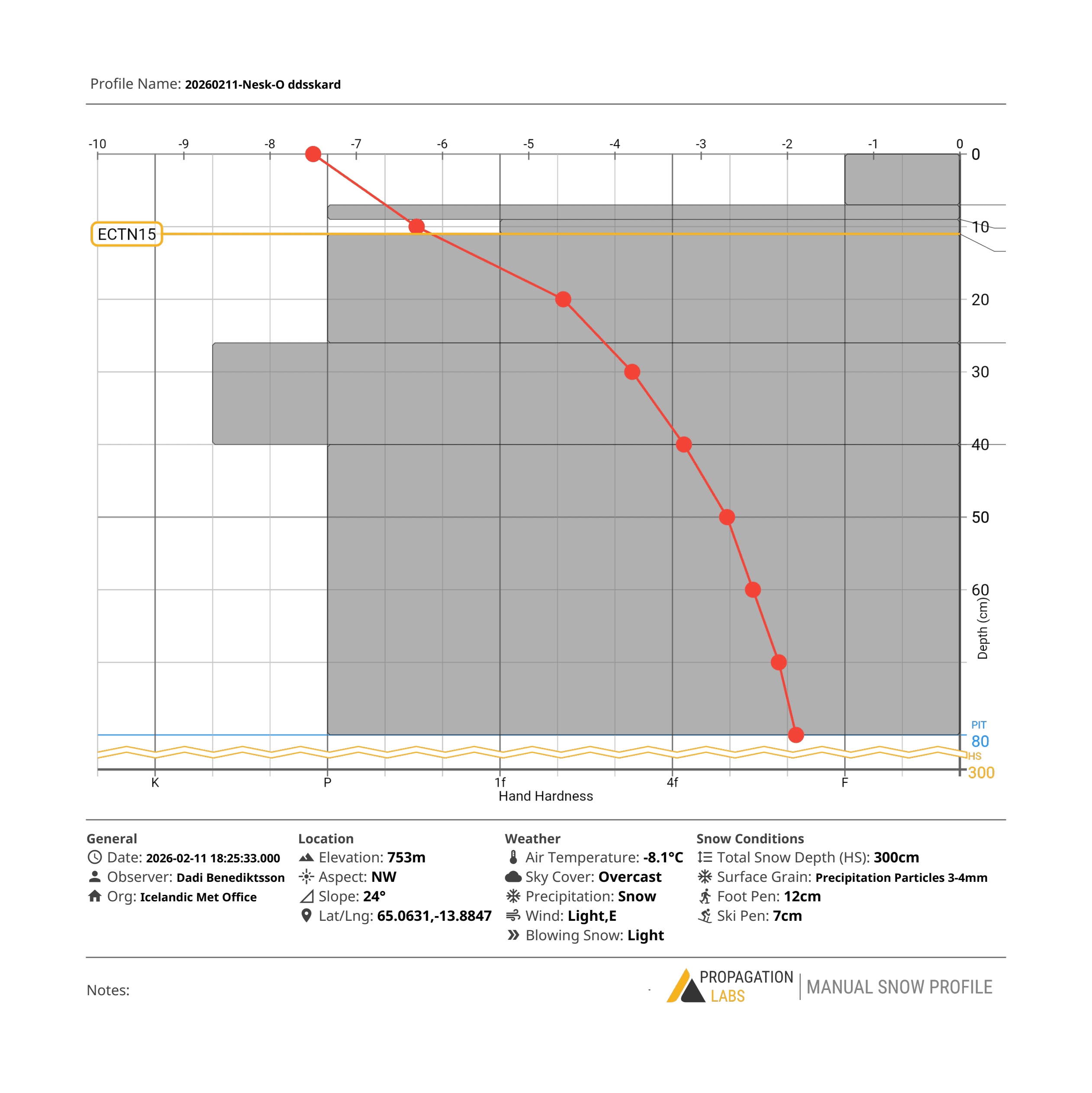 Gryfja sem tekin var í Oddsskarði sýndi einsleitan stífan snjó. Stöðugleikapróf framkölluðu engin brot nema í yfirborðssnjónum þar sem kom brot en það var viðloðun og ekki tilhneiging til að breiðast út.