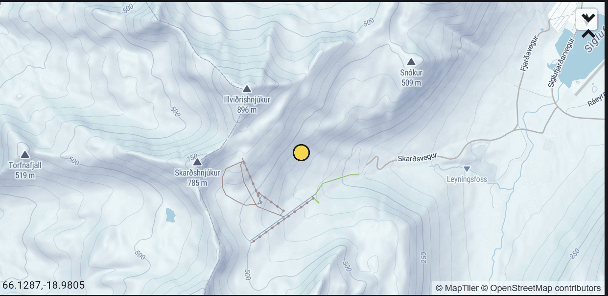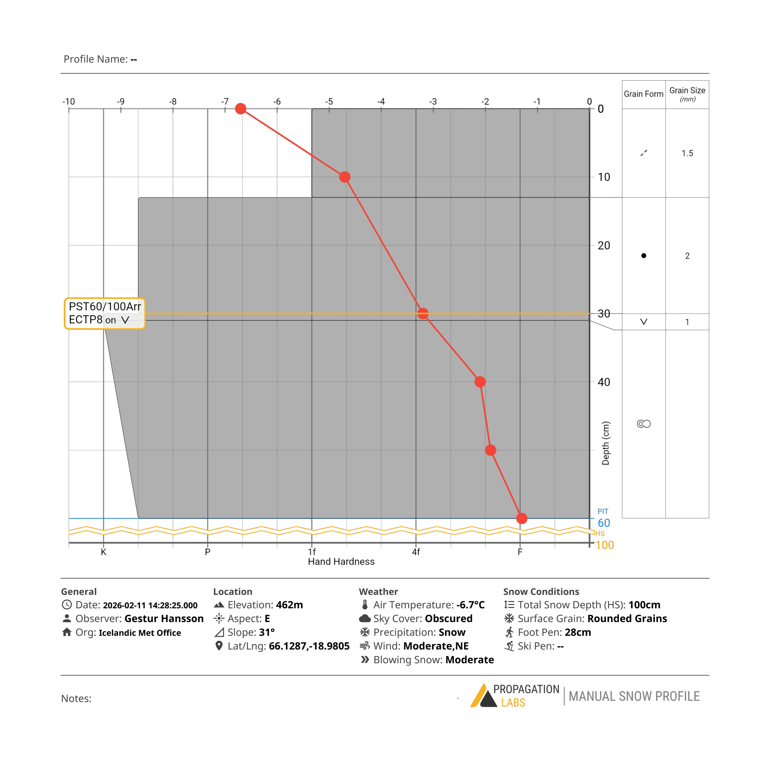 Gryfja var tekin í Skarðsdal í um 460 m hæð og í austlægu viðhorfi. Um 30 cm þykkur, stífur vindfleki var ofan á eldra hjarni þar sem gryfjan var gerð. Grafið yfirborðshrím og kanntaðir kristallar voru á lagmótunum við hjarnið. Stöðugleikapróf gáfu veikar niðurstöður: auðvelt er að framkalla brot sem breiðast út.