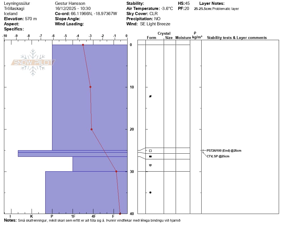 Snjógryfja var gerð í norðvesturhlíðum Leyningssúla í Skarðsdal við Siglufjörð. Snjógryfjan sýnir talsverðan veikleika á lágmótunum milli eldra hjarns og nýs vindfleka. Áberandi lag af köntuðum kristöllum er á þessum lagmótum og tvö stöðugleikapróf sýndu að það er auðvelt að framkalla brot og það hefur líka tilhnegingu til að breiðast út. Svipaður veikleiki hefur sést á Eyjafjarðarsvæðinu þar sem hafa fallið nokkur nýleg snjóflóð en ekki hafa sést nein flóð við Siglufjörð.