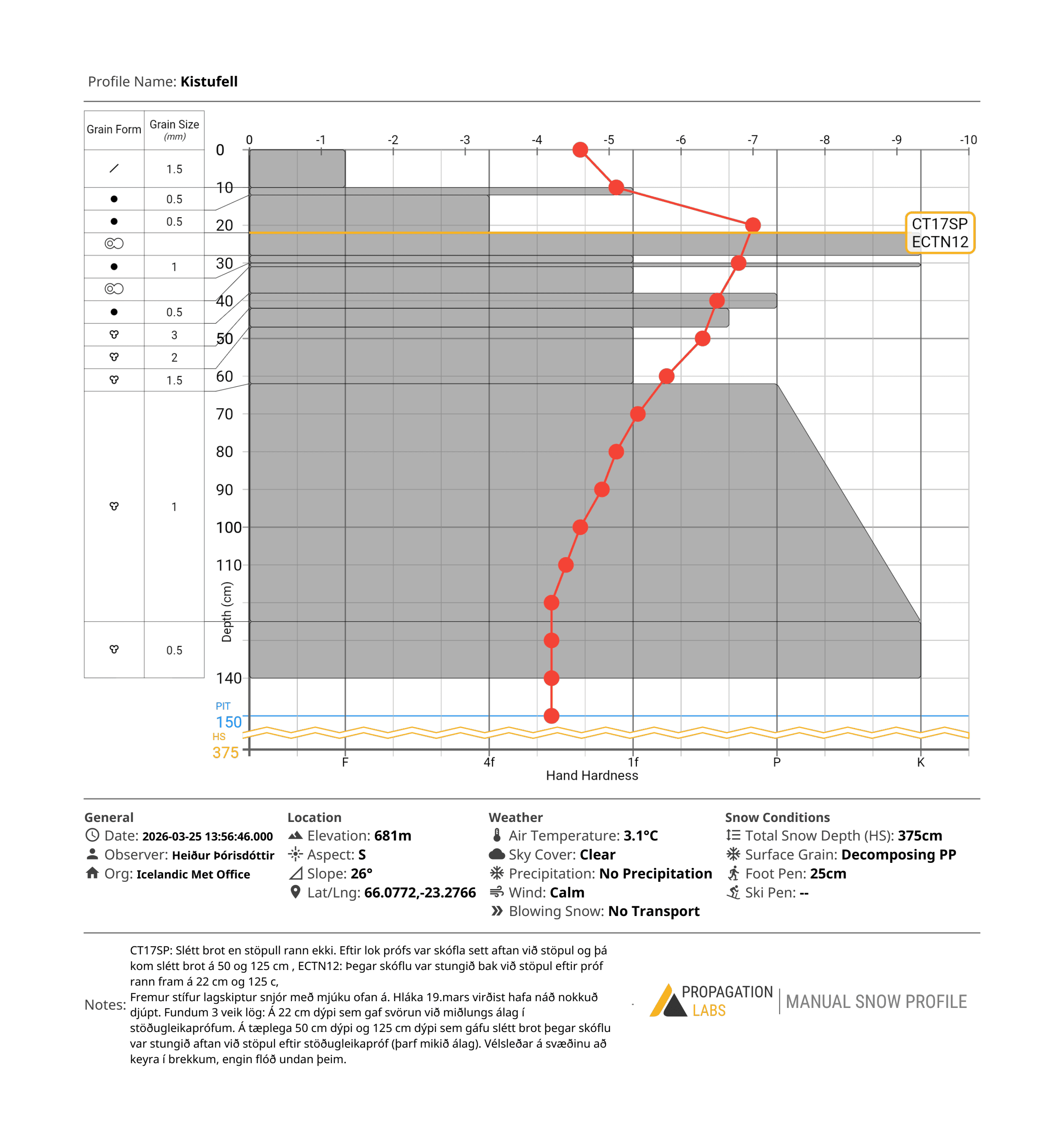 Snjógryfja var tekin miðvikudaginn 25. mars, undir Kistufelli inn af Skutulsfirði á Vestfjörðum. Gryfjan var í 680 m hæð og suðurvísandi brekku. Gryfjan sýndi lagskiptan nokkuð stífan snjó með 22 cm af mýkri snjó ofan á. Hláka 19. mars virðist hafa verkað nokkuð djúpt ofan í snjóþekjuna. Þrjú veik lög fundust. Veika lagið á 22 cm dýpi brast við miðlungs álag á samþjöppunarprófi og brotið var slétt. Í útvíkkuðu samþjöppunarprófi kom brot á sama lagi við miðlungs álag en það breiddi þó ekki úr sér. Hin veiku lögin voru dýpra, á tæplega 50 cm dýpi og 125 cm dýpi. Stöðugleikapróf gáfu ekki svörun þar en þegar skóflublaði var stungið aftan við stöpul að prófunum loknum komu slétt brot á báðum stöðum. Ólíklegt er talið að snjóflóð falli á þessum dýpri veikleikum en ef það gerist geta þau orðið stór.