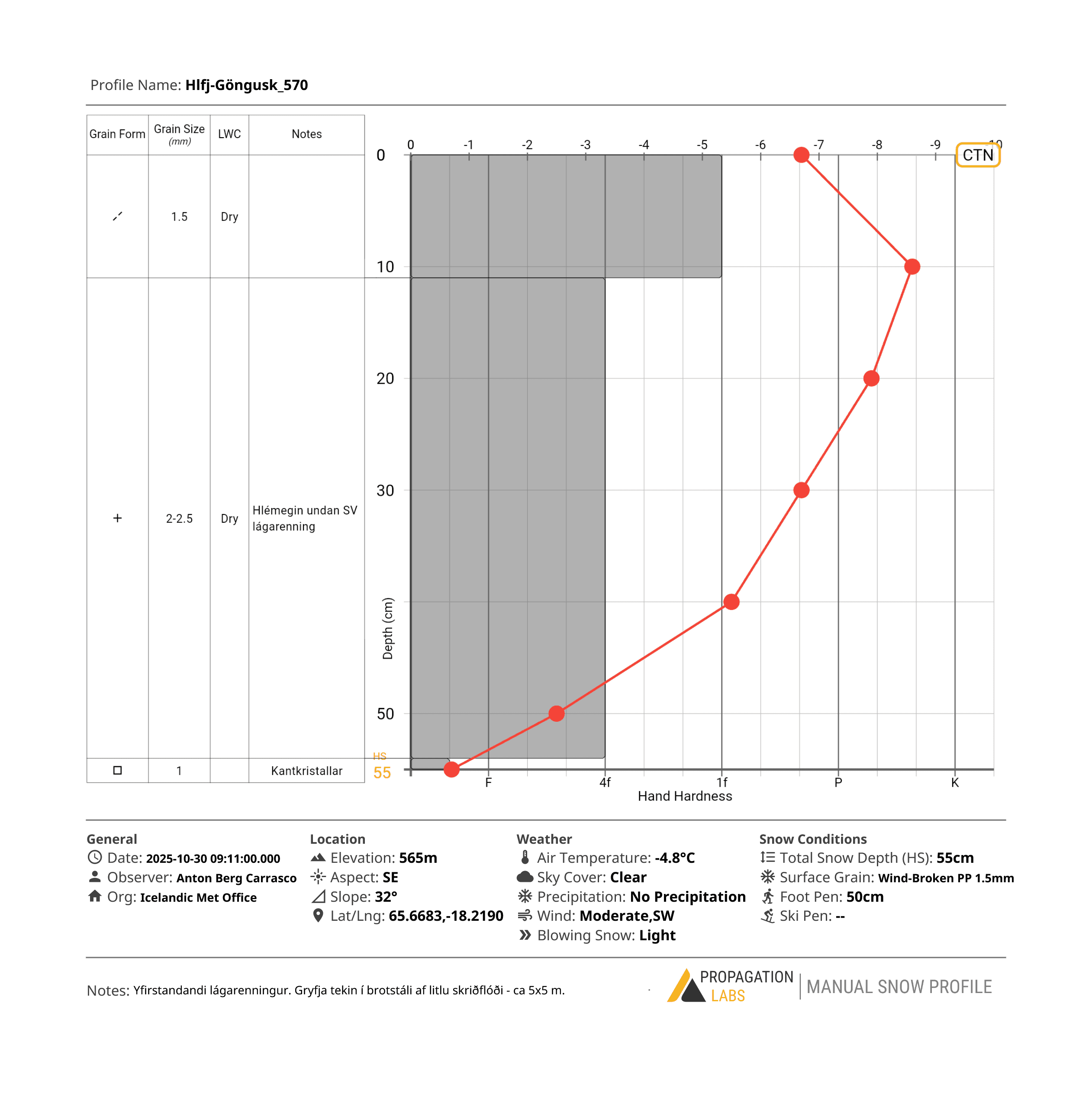 Gryfjan í Hlíðarfjalli var gerð í um 570 m hæð í SA-vísandi brekku í um 32° halla. Dálítill skafrenningur var á svæðinu. Heildar snjódýpt var um 55 cm. Gryfjan sýnir vindniðurbrotinn snjó (vindfleka) ofan á nýsnævi. Við jörð var þunnt lag af köntuðum kristöllum. Gryfjan sýnir háan hitastigul á köflum. Samþjöppunarpróf gaf ekkert brot.