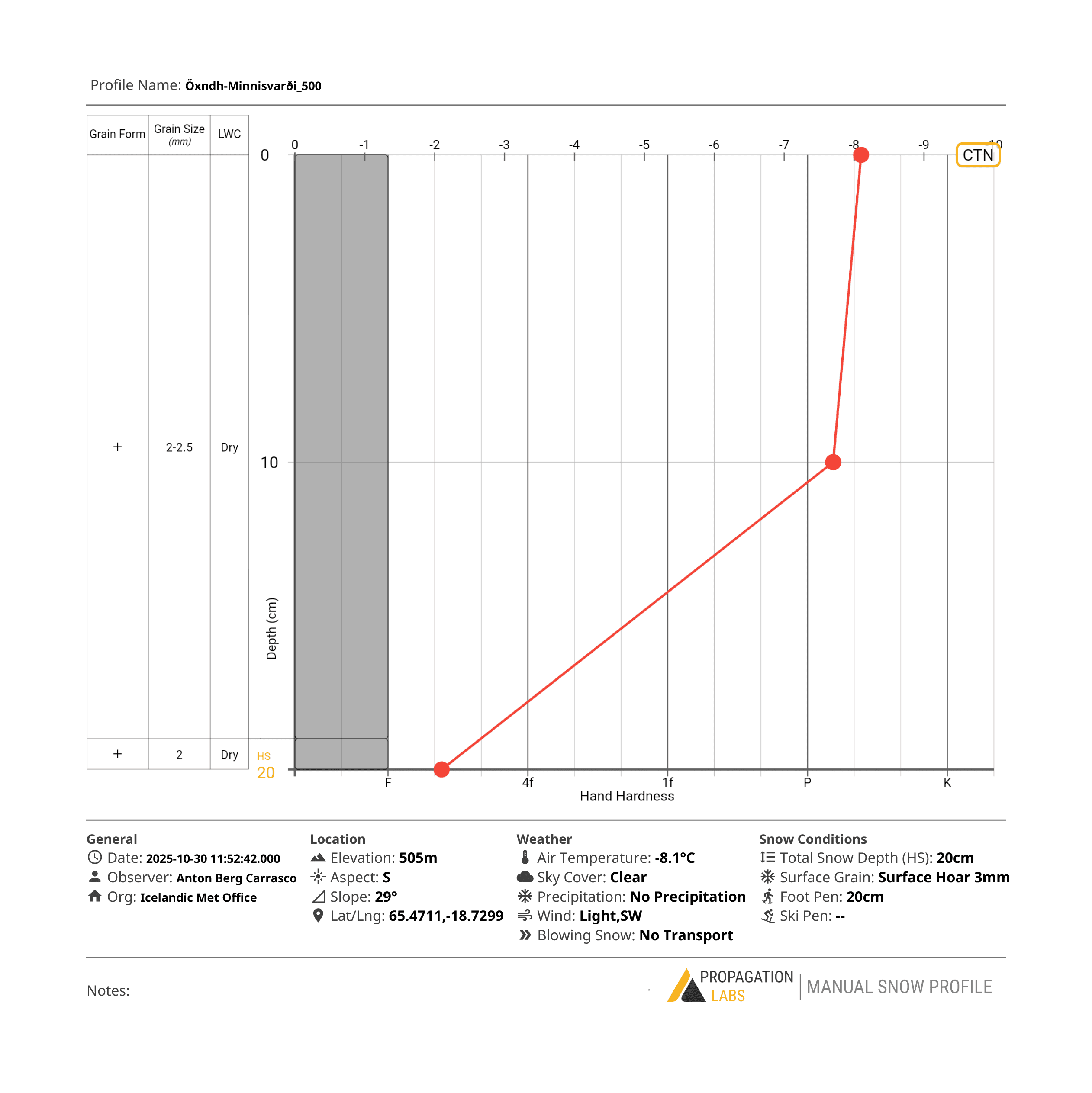 Gryfjan í Öxnadal var gerð í um 500 m hæð í S-vísandi brekku í um 29° halla. Heildar snjódýpt var aðeins um 20 cm og var snjóþekjan einsleit með nýsnævi. Mjög hár hitastigull var í gryfjunni. Samþjöppunarpróf gaf ekkert brot.