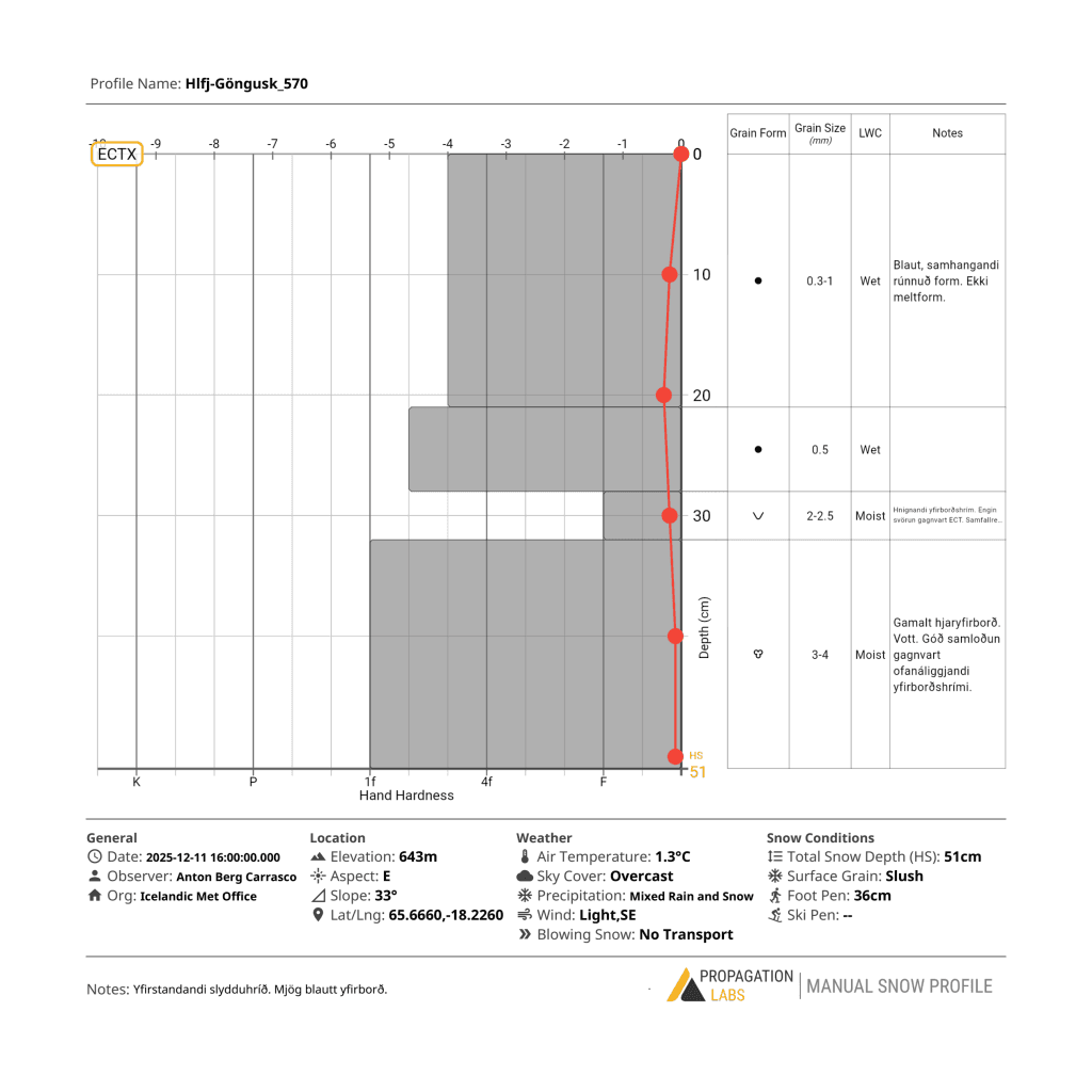 Skíðagæslumenn í Hlíðarfjalli gerðu snjógryfju í Strýtu sama dag sem sýndi svipaða lagskiptingu; kantaða kristalla á um 50 cm dýpi undir stífnuðum vindfleka og yfir eldra hjarni.