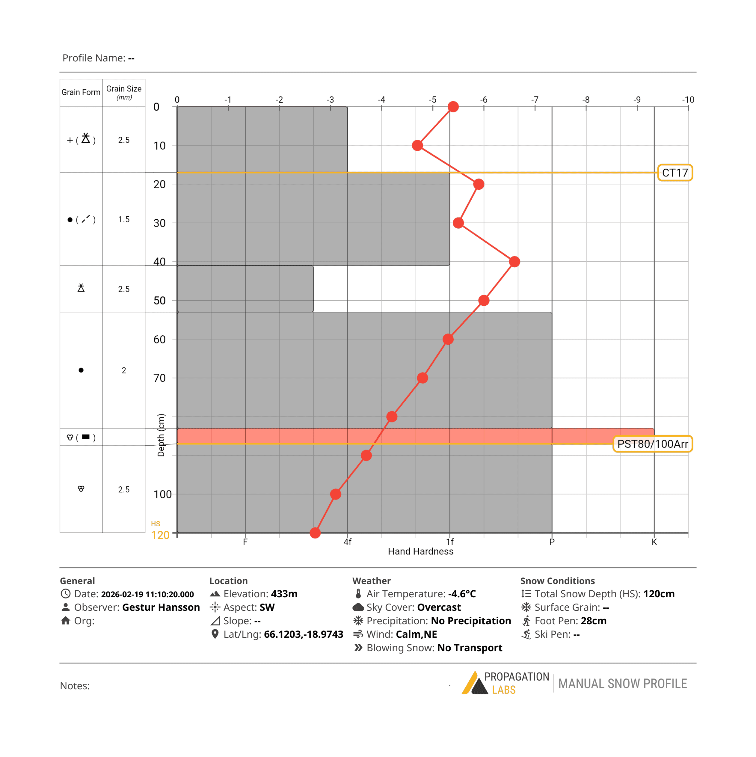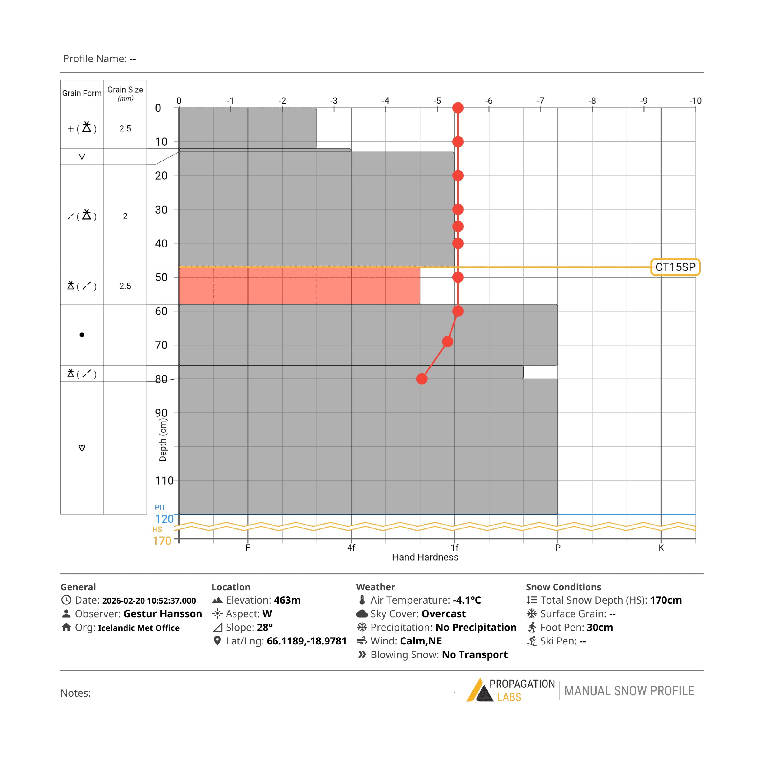 Snjógryfjur voru teknar í Skarðsdal, skíðasvæði Siglufjarðar, bæði á fimmtudag og föstudag, 19. og 20. febrúar. Gryfjurnar voru teknar á svipuðum stað, í u.þ.b. 450 m hæð og vestur- eða suðvesturvísandi brekku. Veik lög eru í snjónum, þau viðkvæmustu eru ofarlega. Á rúmlega 10 cm dýpi á lagmótum lausamjallar og snjós sem hefur skafið er grafið yfirborðshrím. Á u.þ.b. 50 cm dýpi er veikt lag með hagli. Heilt yfir virðist snjór á svæðinu þó smám saman vera að styrkjast.