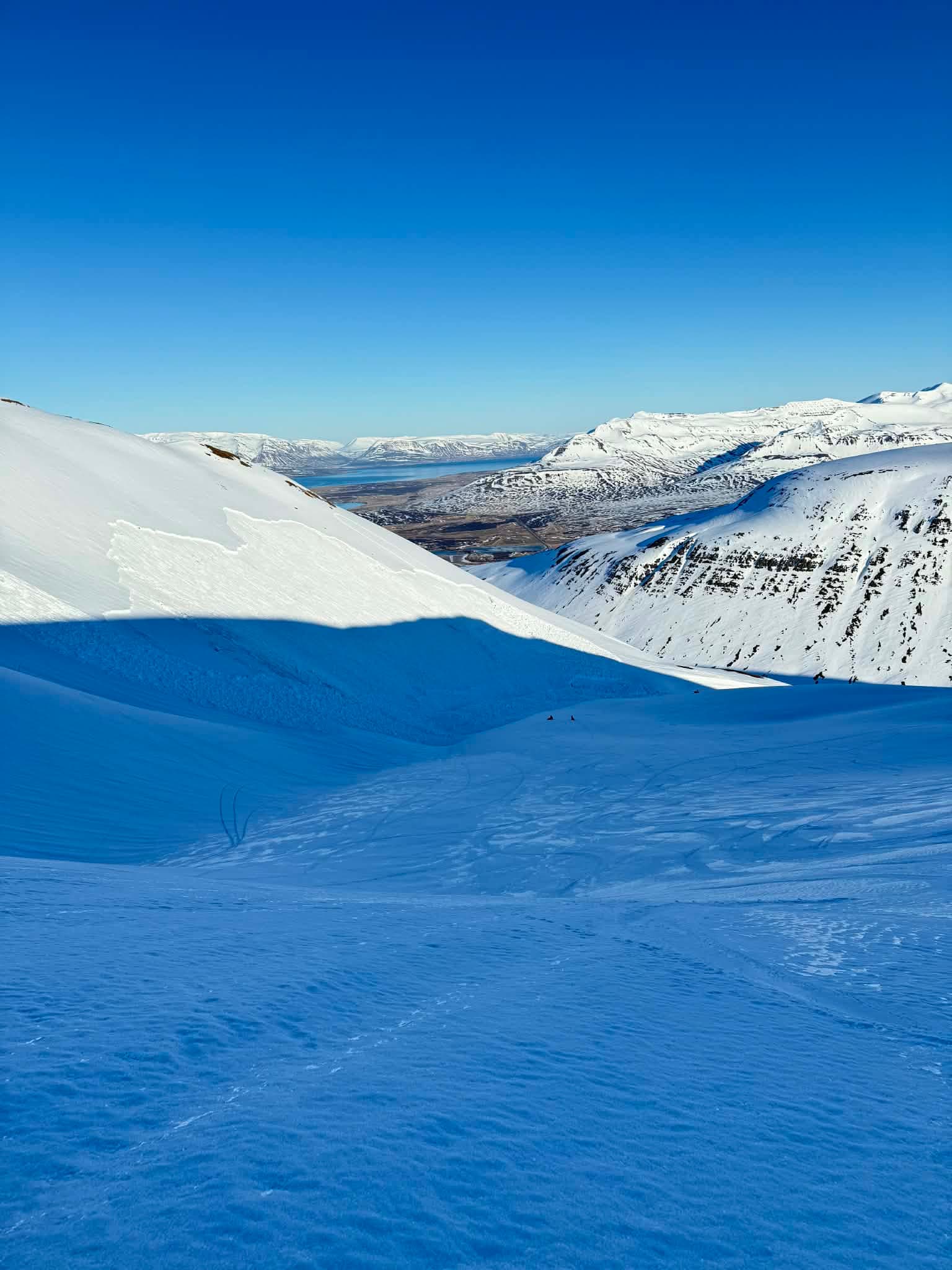 Breitt og þykkt flekahlaup féll undan vélsleða í sólbakaðri hlíð Mjódals á Upsadal vestan Dalvíkur í gær, beltahjól fyrir miðri mynd og Böggvisstaðafjall og mynni Svarfaðardals í baksýn.